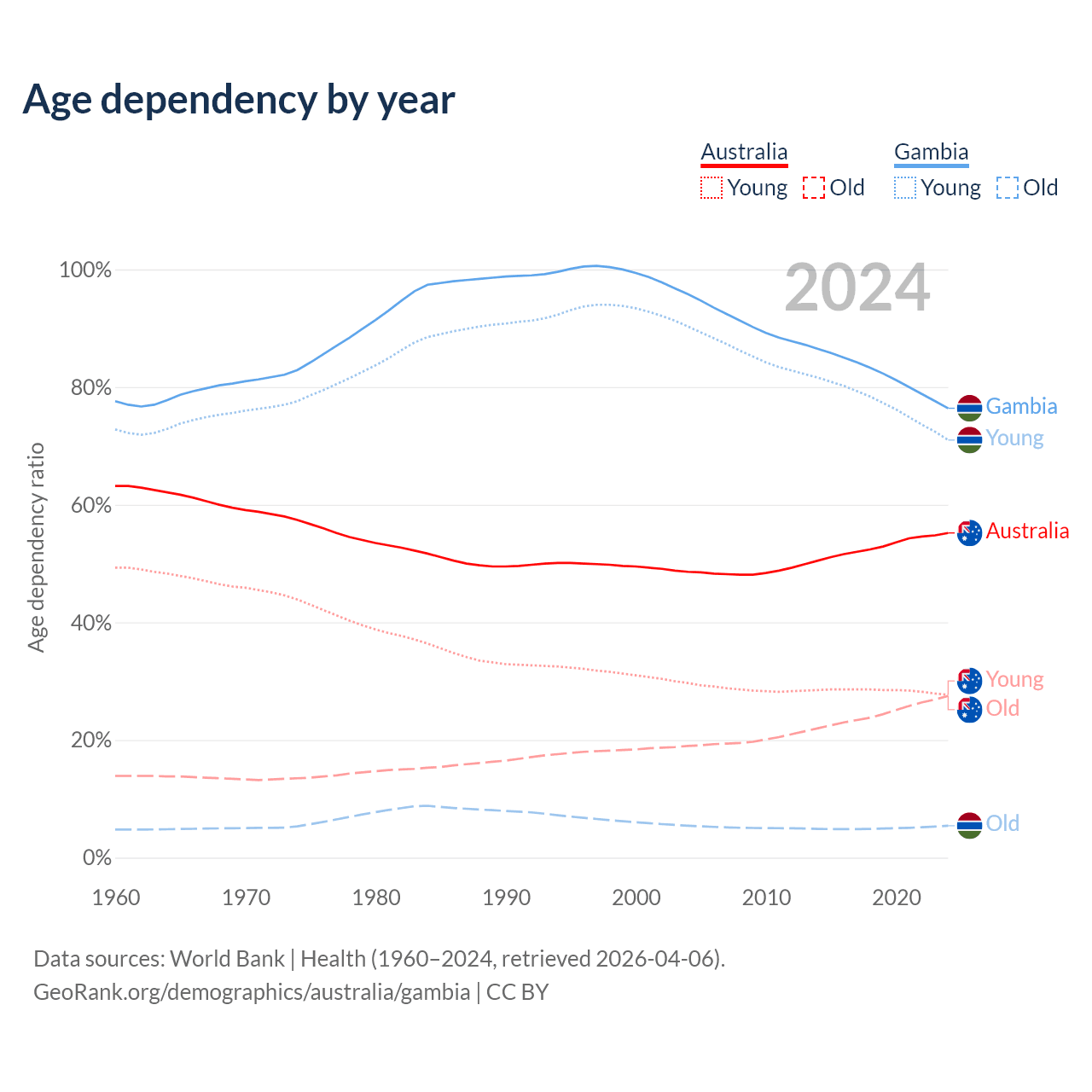 The share of older people aged 65 and over is 17.7% in Australia and 3.08% in the Gambia. Life expectancy in Australia compared to the Gambia .