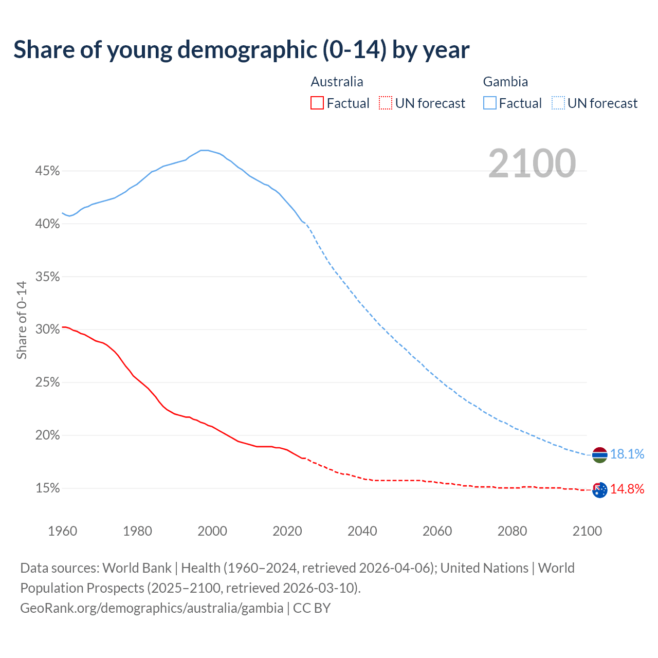 - The share of young demographic (0-15 years old) in Australia is 17.8% vs 40.2% in the Gambia.