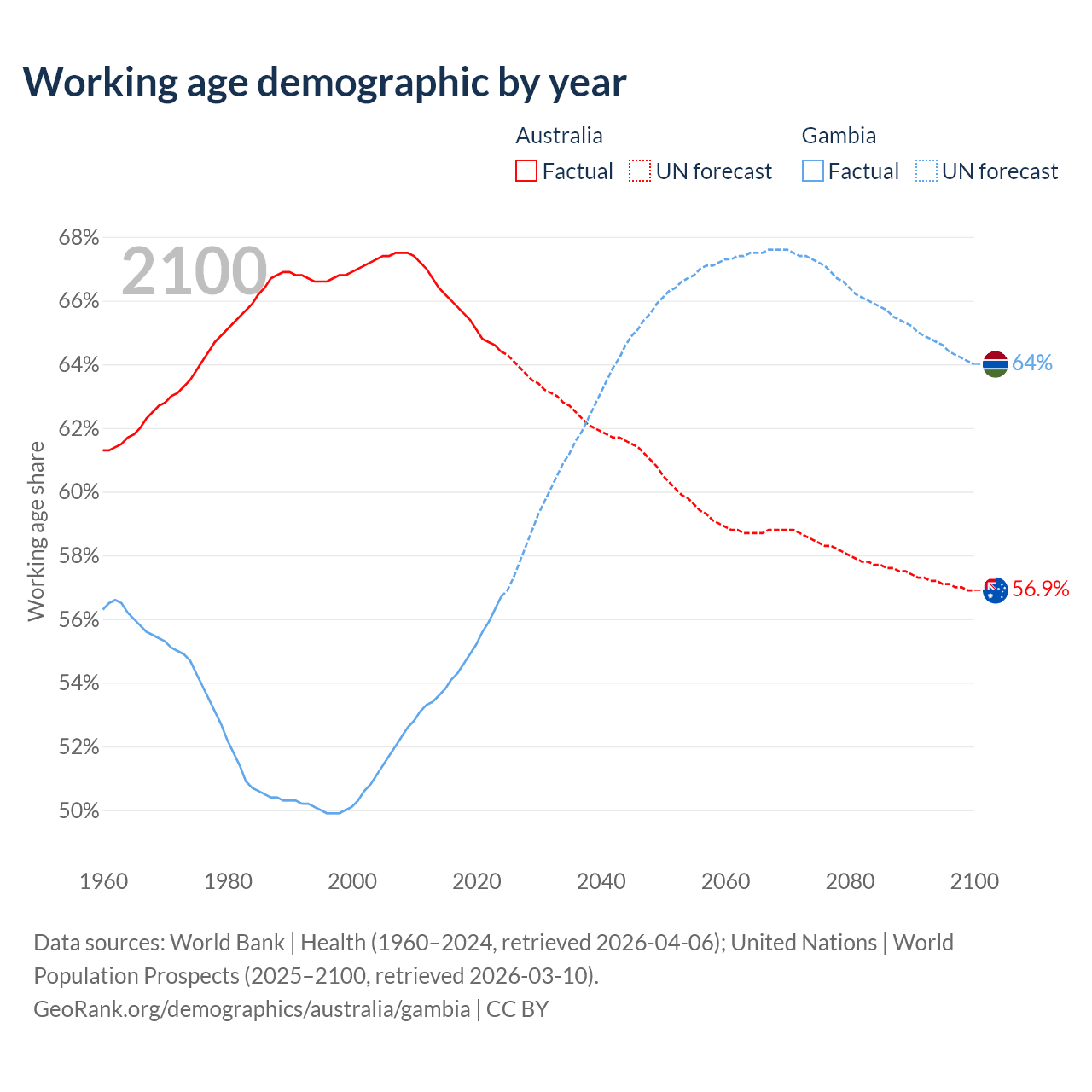 - Australia has 17.9M working age adults (aged 15-64) vs 1.64M in the Gambia.