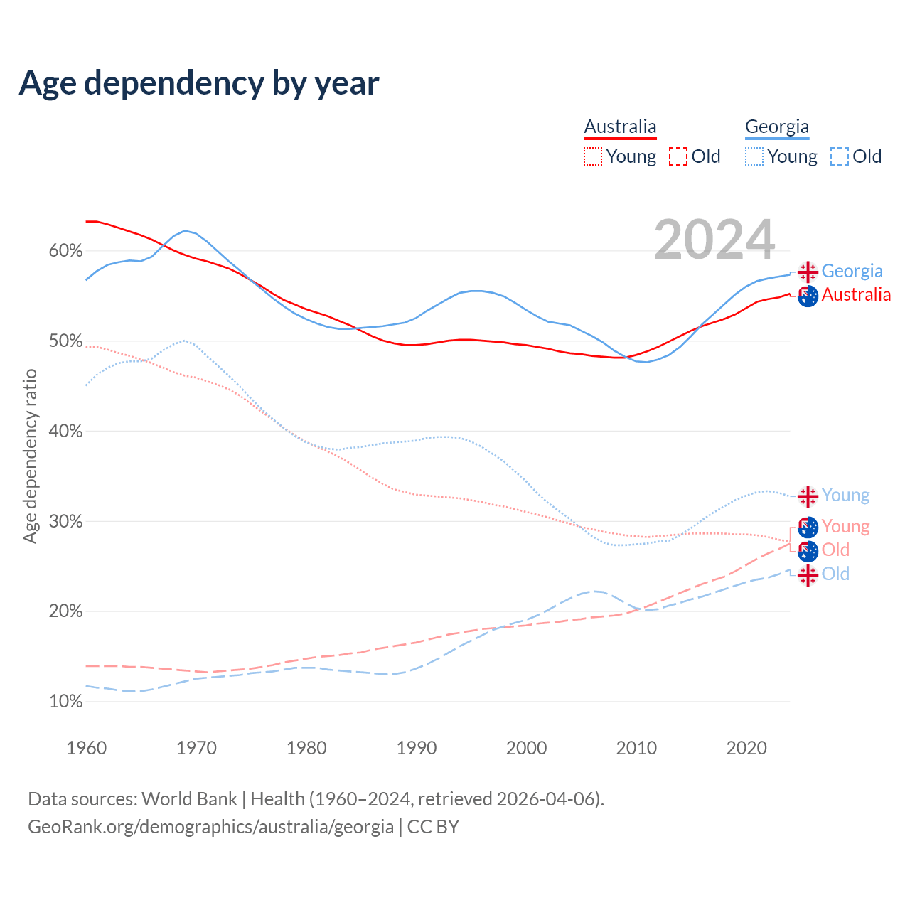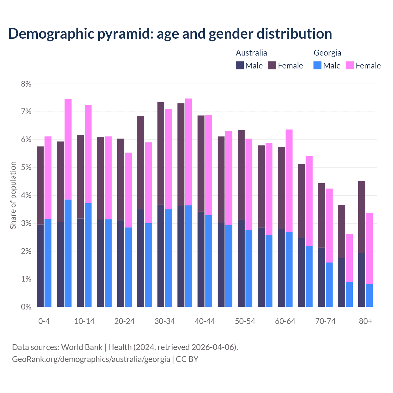 - Australia is ranked 55/196 by median age (oldest to youngest) vs 59/196 for Georgia.