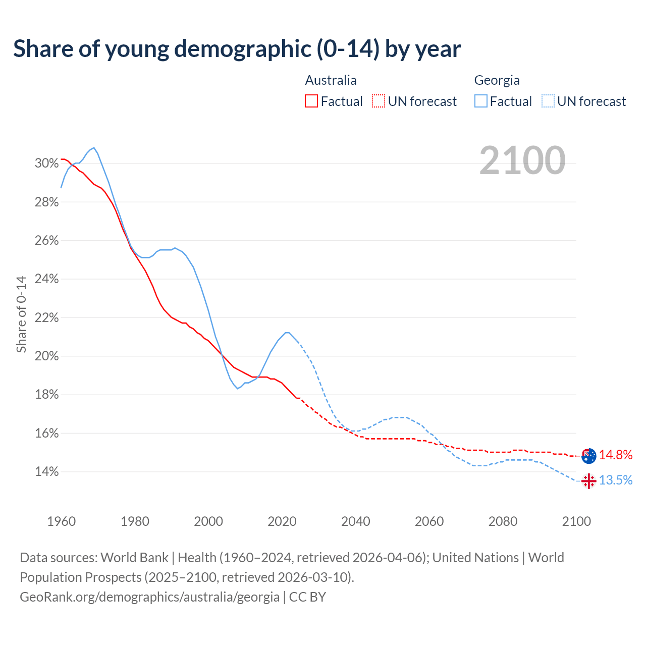 - The share of young demographic (0-15 years old) in Australia is 17.8% vs 20.8% in Georgia.