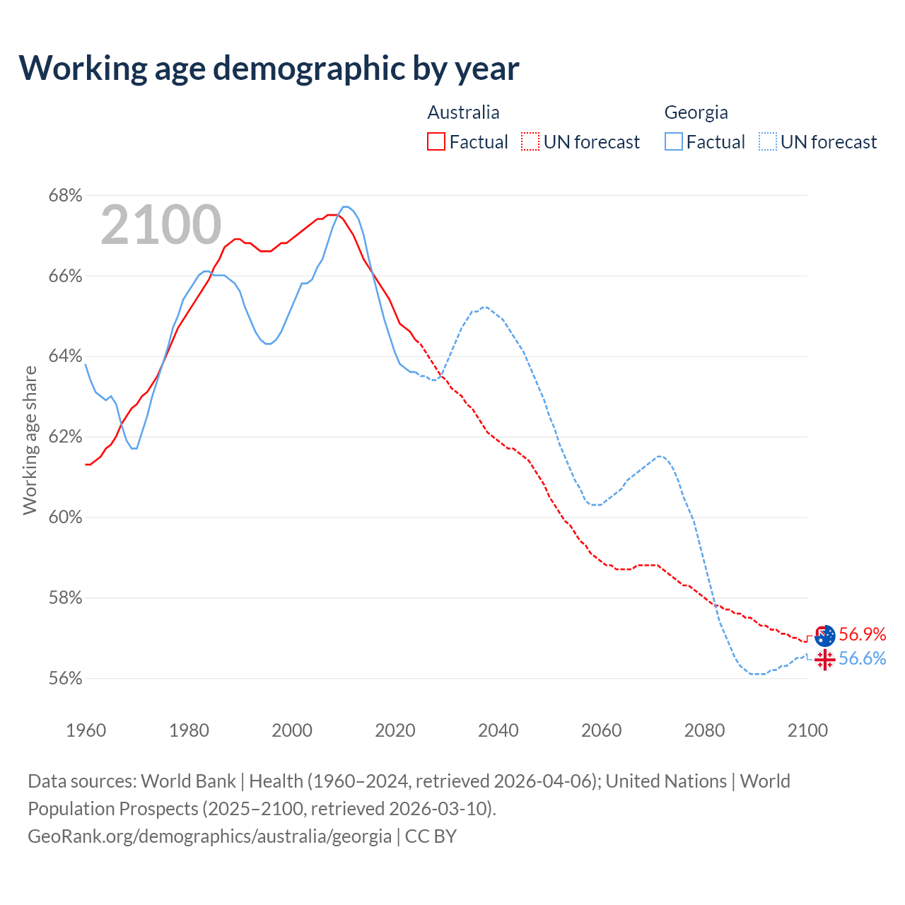 Median age Australia vs Georgia, 1960-2100