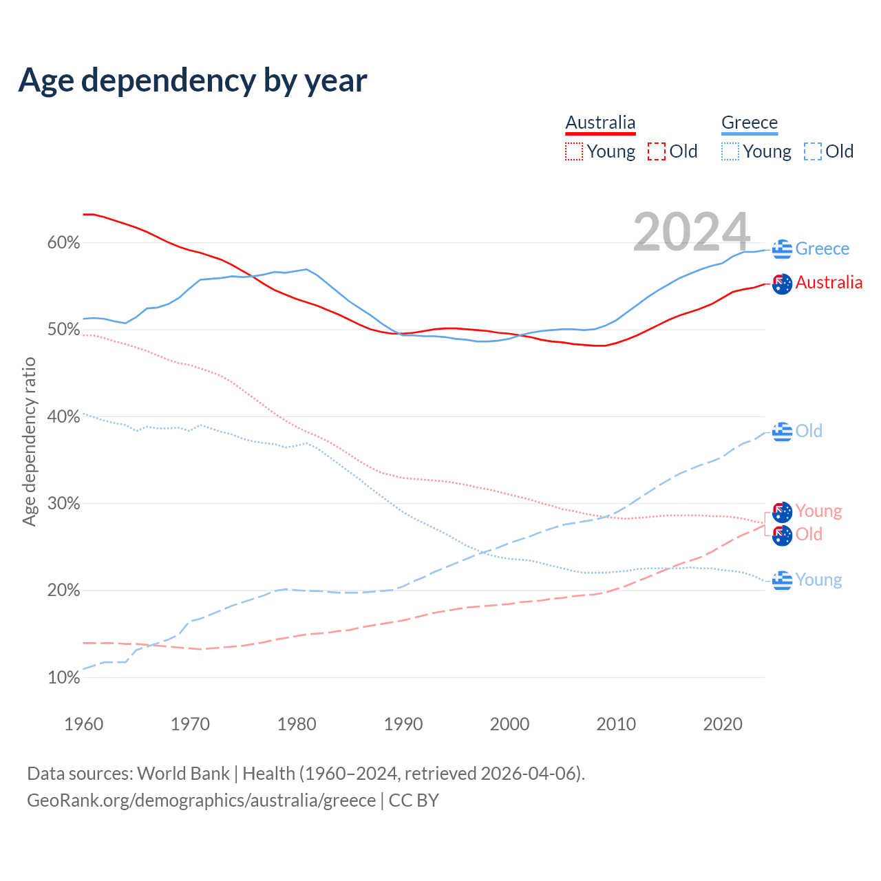 - Australia is ranked 55/196 by median age (oldest to youngest) vs 6/196 for Greece.