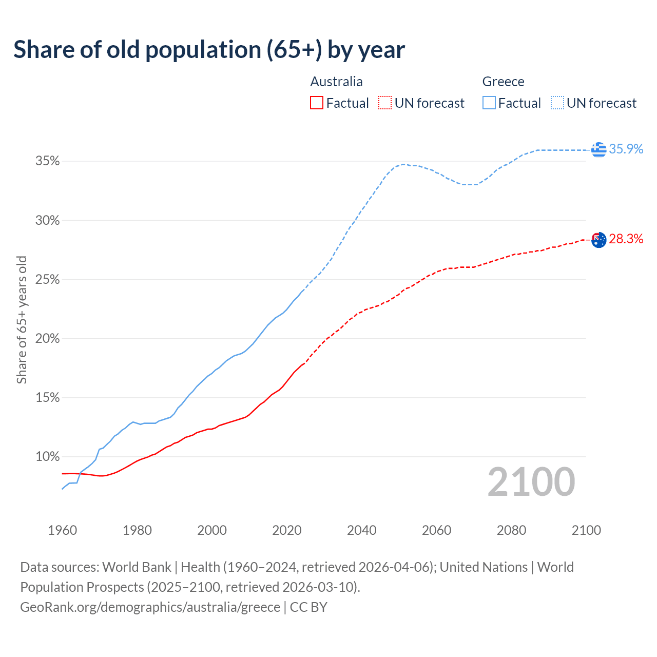 The share of older people aged 65 and over is 17.7% in Australia and 23.9% in Greece. Life expectancy in Australia compared to Greece .