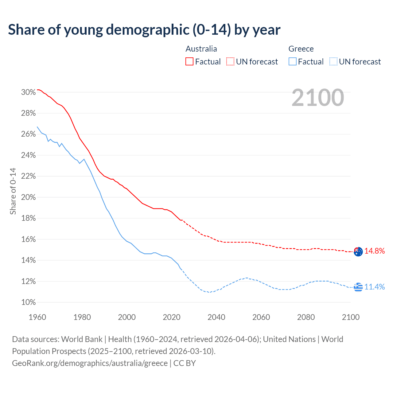 - The share of young demographic (0-15 years old) in Australia is 17.8% vs 13.2% in Greece.
