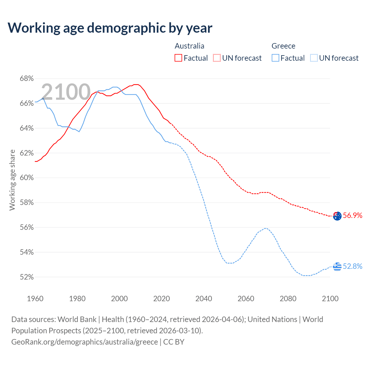Median age Australia vs Greece, 1960-2100