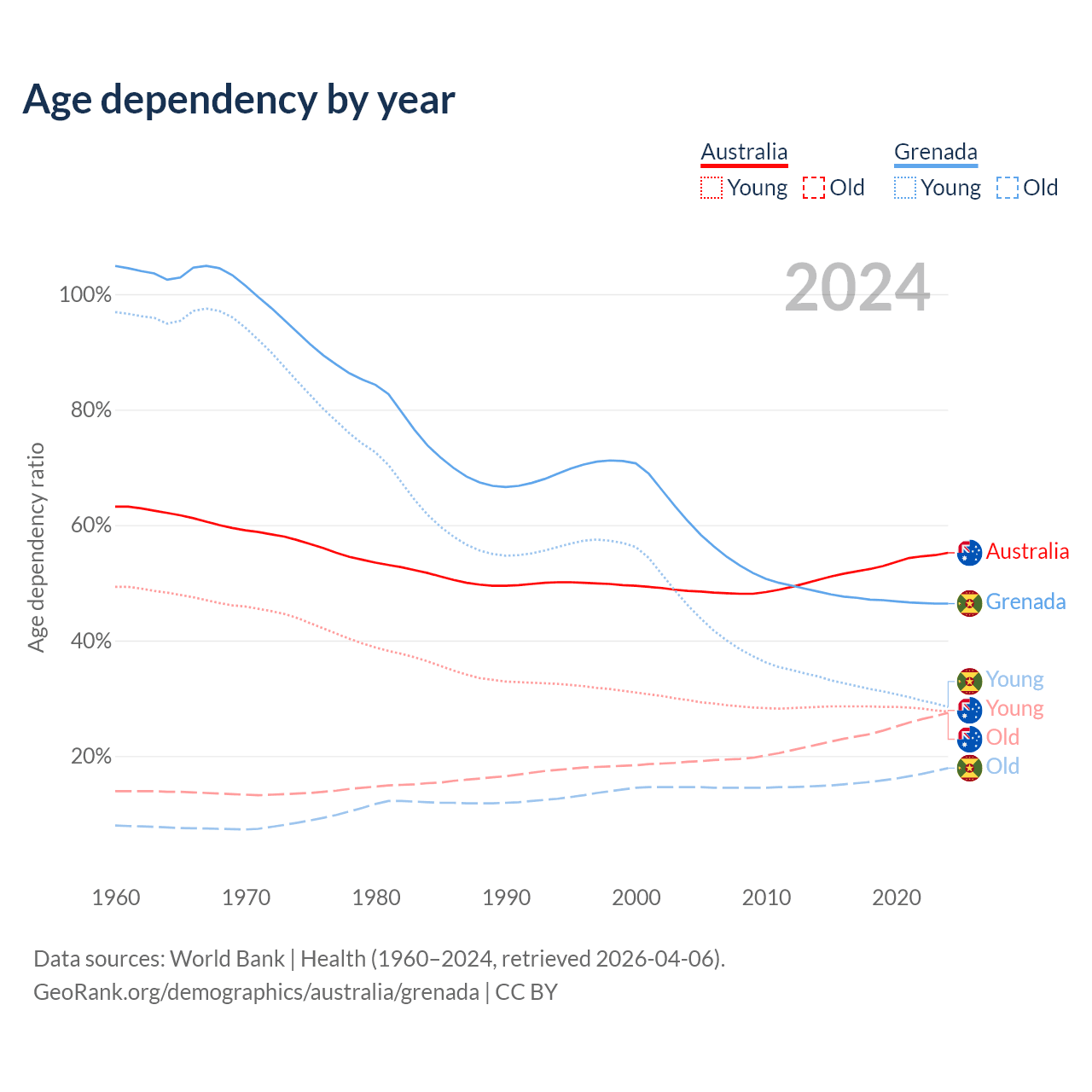 - The share of old-age demographic (65+) in Australia is 17.7% vs 12.2% in Grenada.