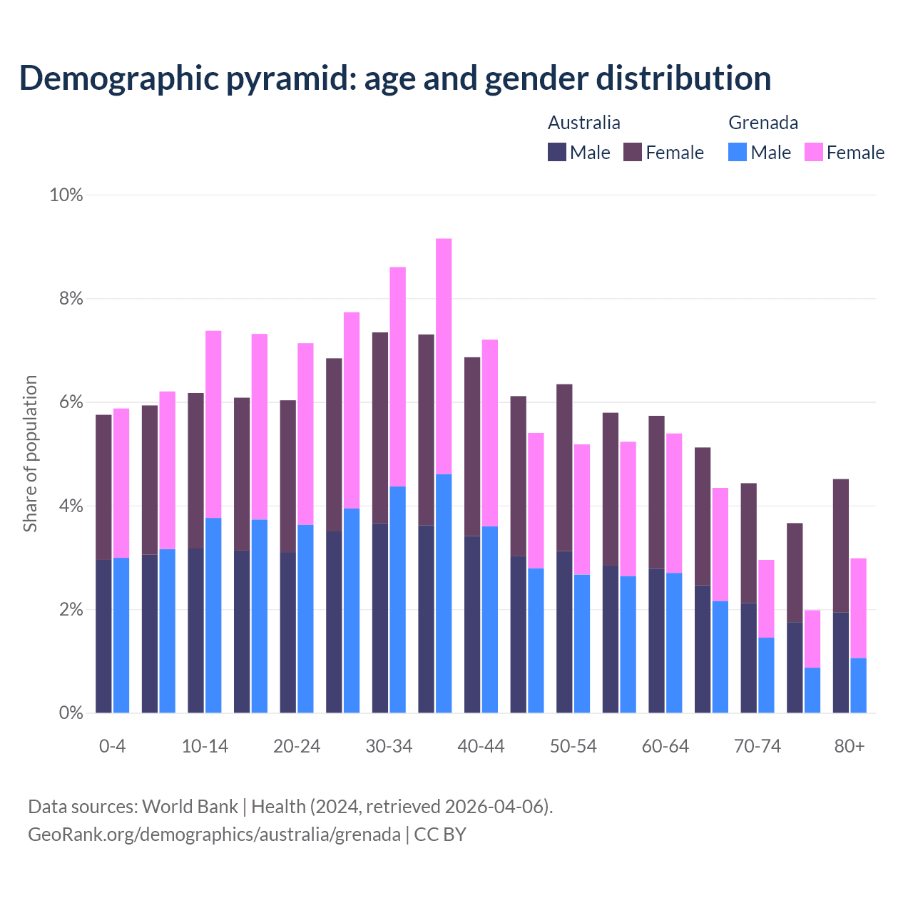 - Australia is ranked 55/196 by median age (oldest to youngest) vs 77/196 for Grenada.