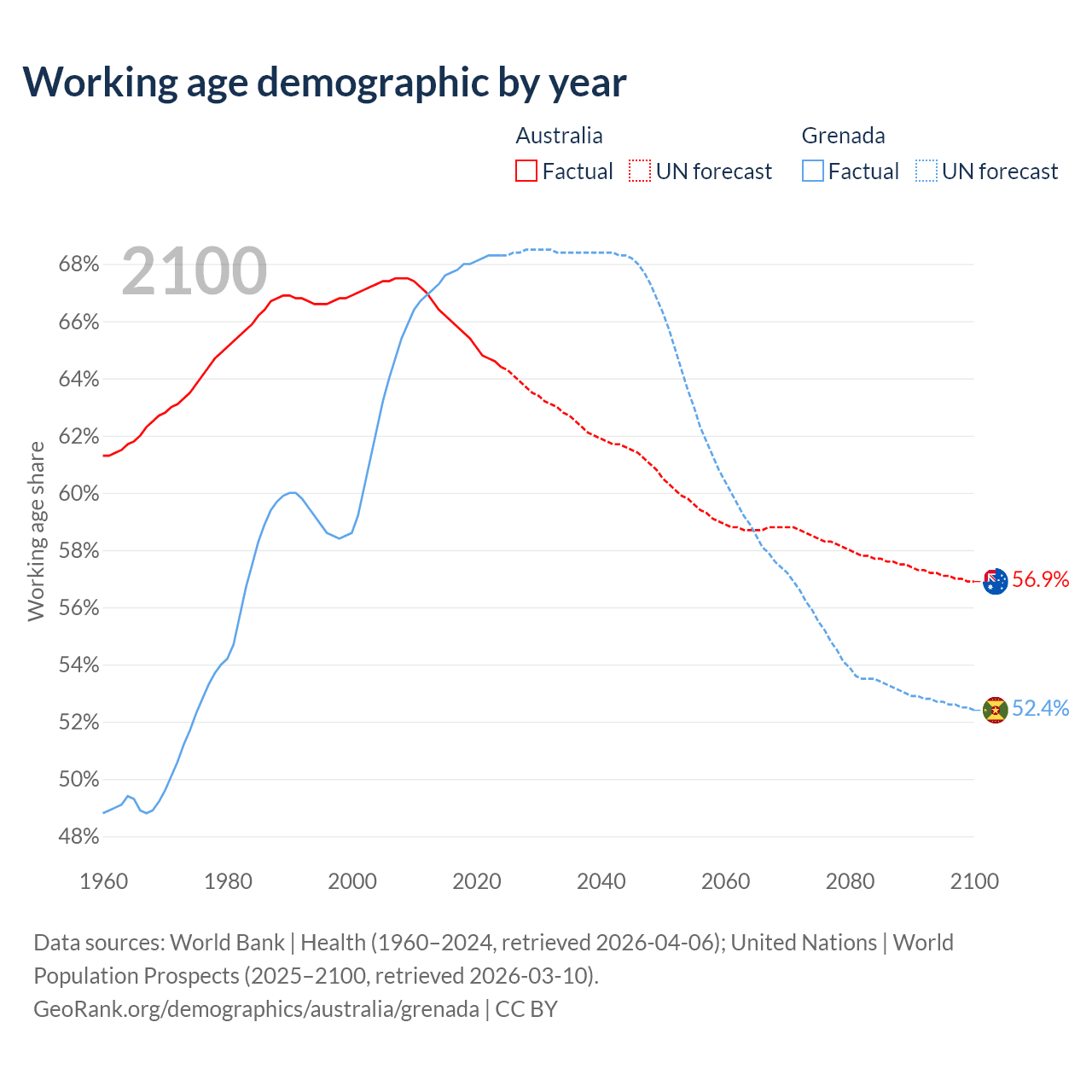 Median age Australia vs Grenada, 1960-2100