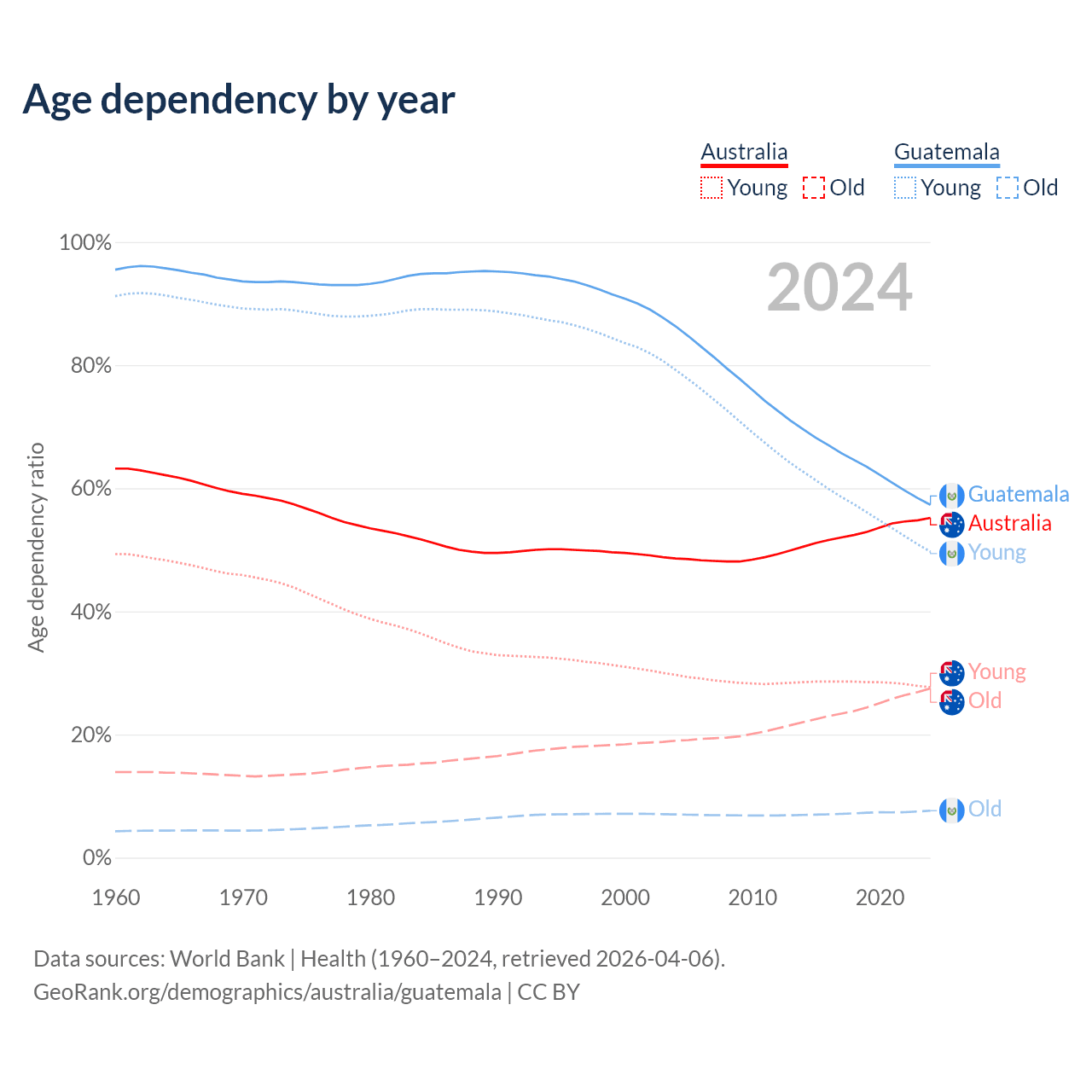 - Australia is ranked 55/196 by median age (oldest to youngest) vs 137/196 for Guatemala.