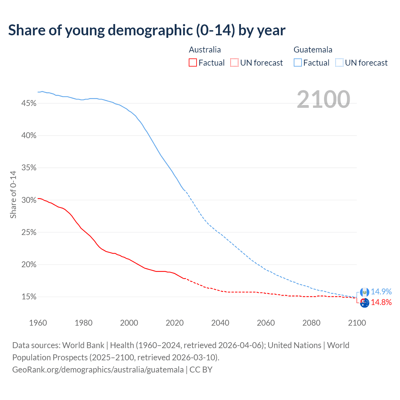 - The share of young demographic (0-15 years old) in Australia is 17.8% vs 31.6% in Guatemala.