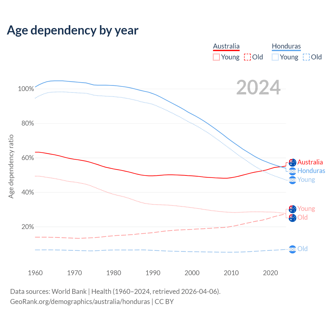 - Australia is ranked 55/196 by median age (oldest to youngest) vs 134/196 for Honduras.