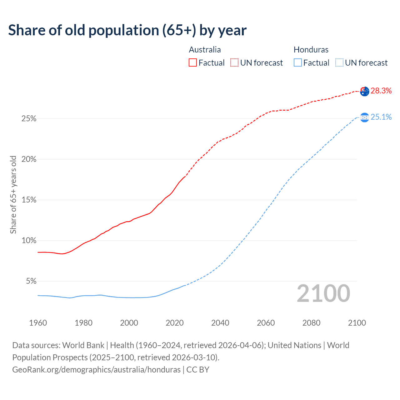 The share of older people aged 65 and over is 17.7% in Australia and 4.42% in Honduras. Life expectancy in Australia compared to Honduras .