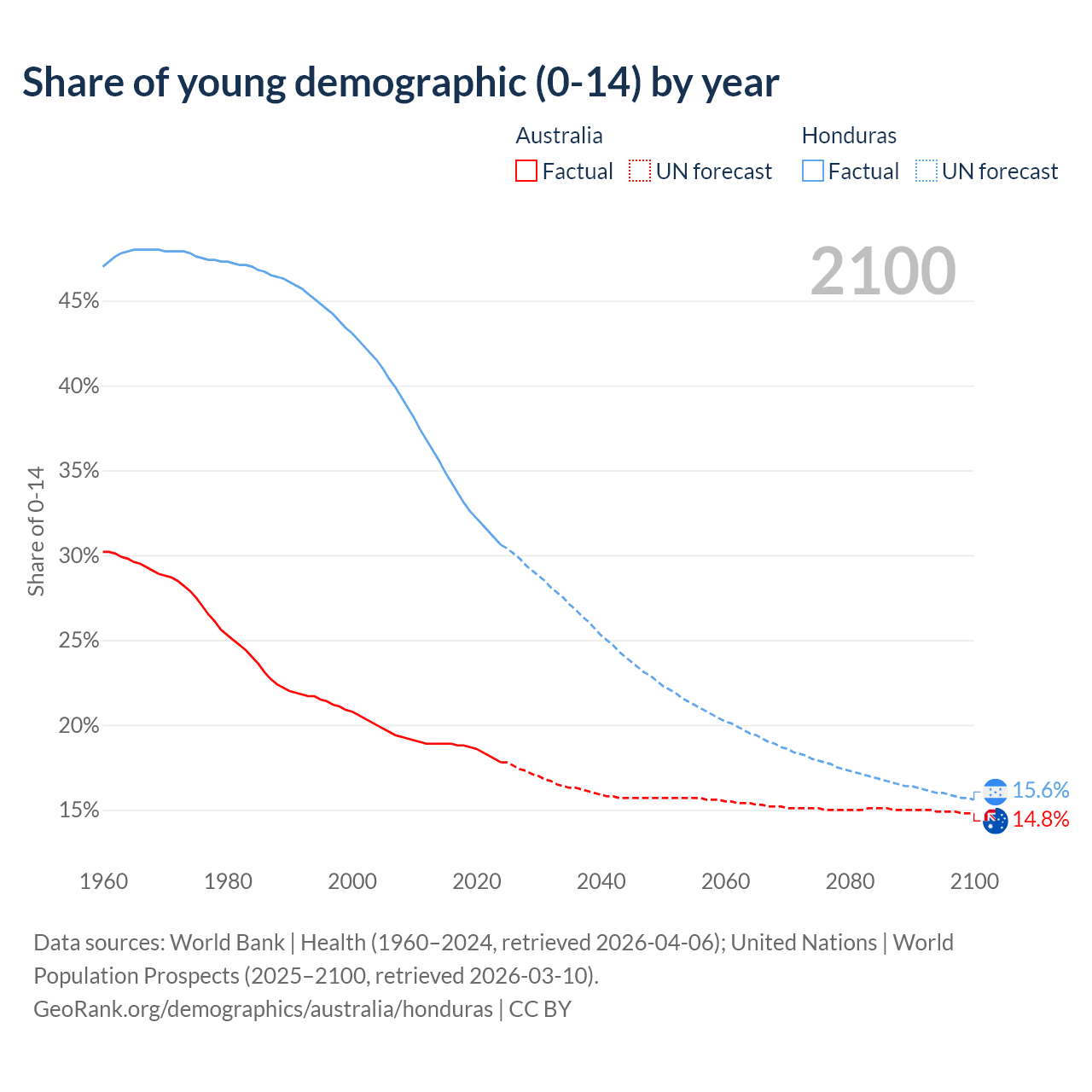 - The share of young demographic (0-15 years old) in Australia is 17.8% vs 30.6% in Honduras.