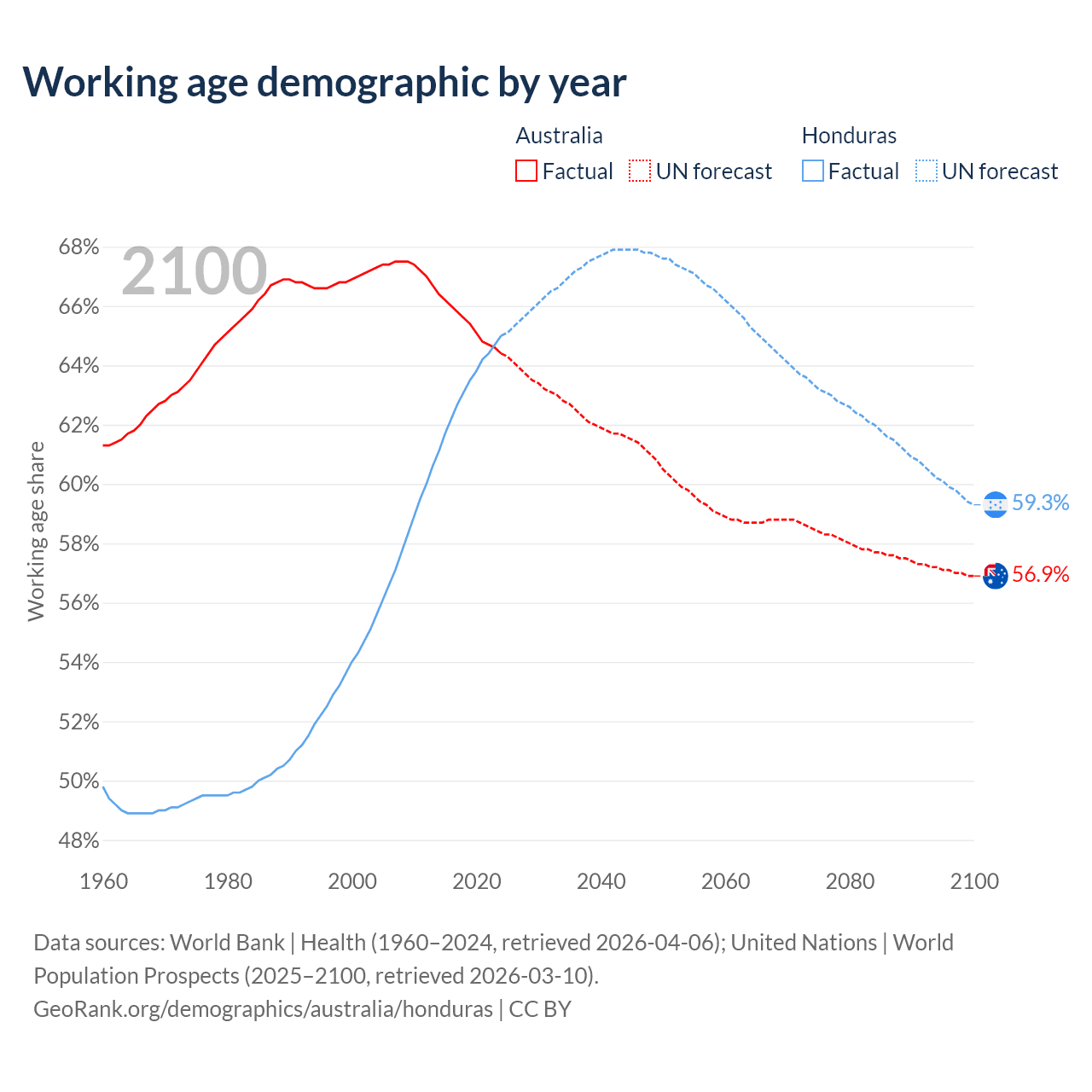 - Australia has 17.9M working age adults (aged 15-64) vs 7.3M in Honduras.