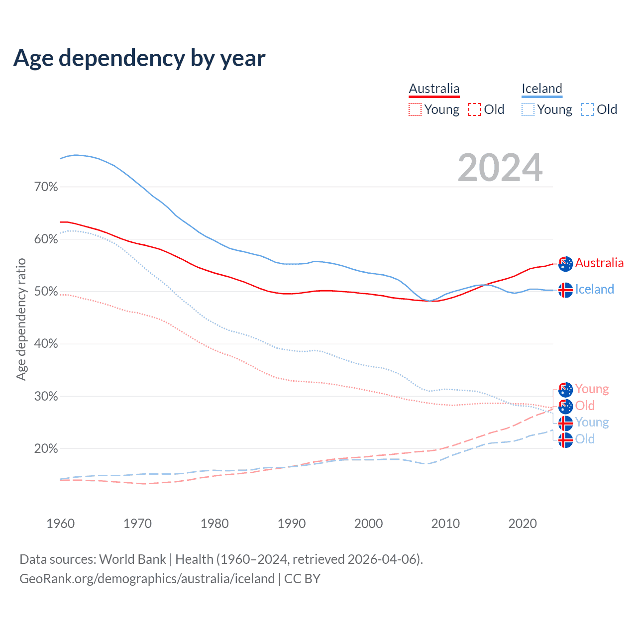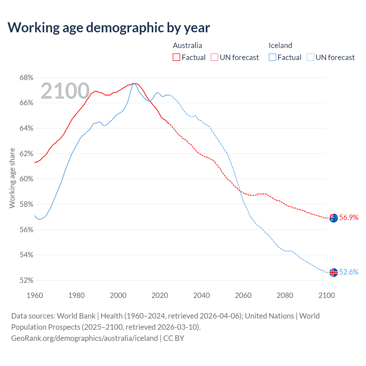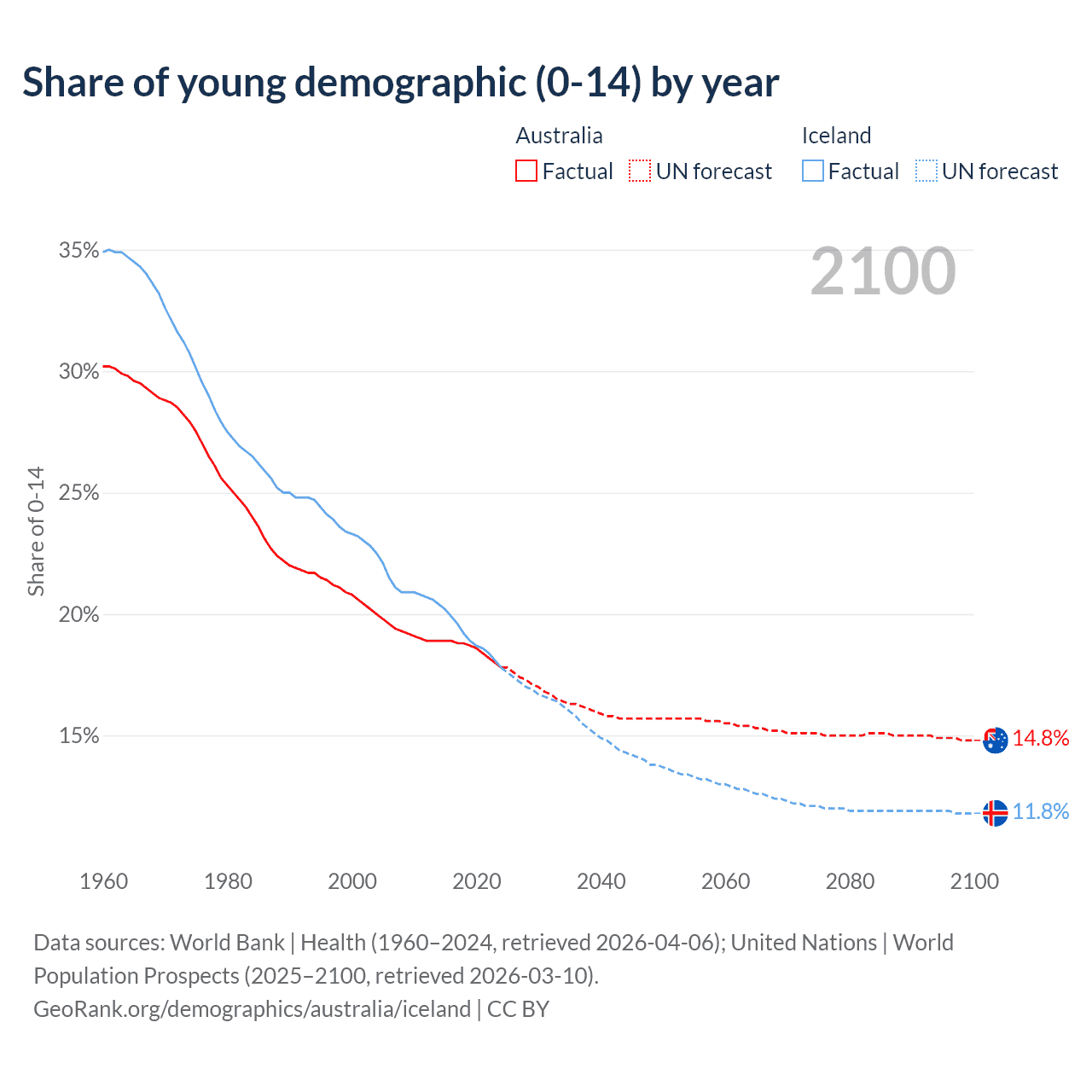 - The share of young demographic (0-15 years old) in Australia is 17.8% vs 17.8% in Iceland.