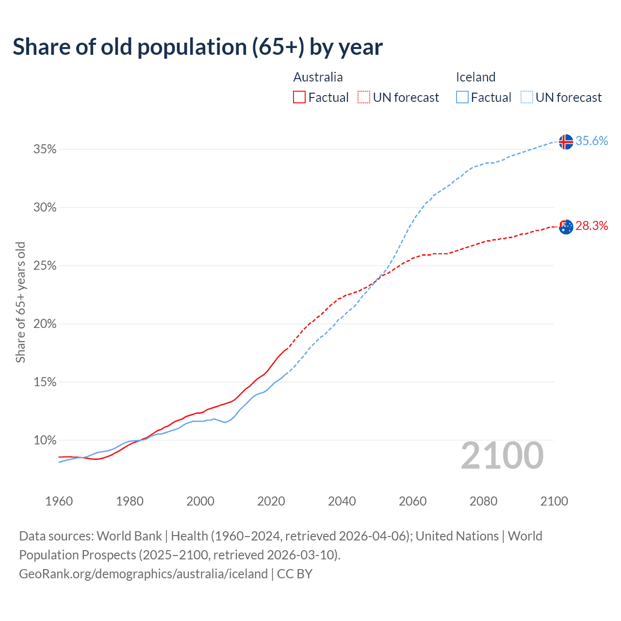 - The share of old-age demographic (65+) in Australia is 17.7% vs 15.6% in Iceland.