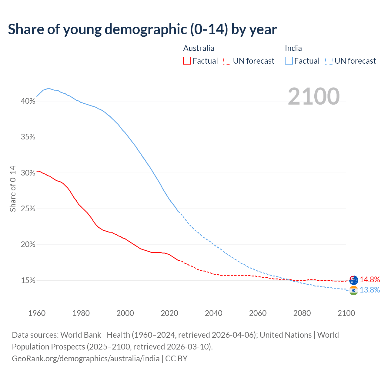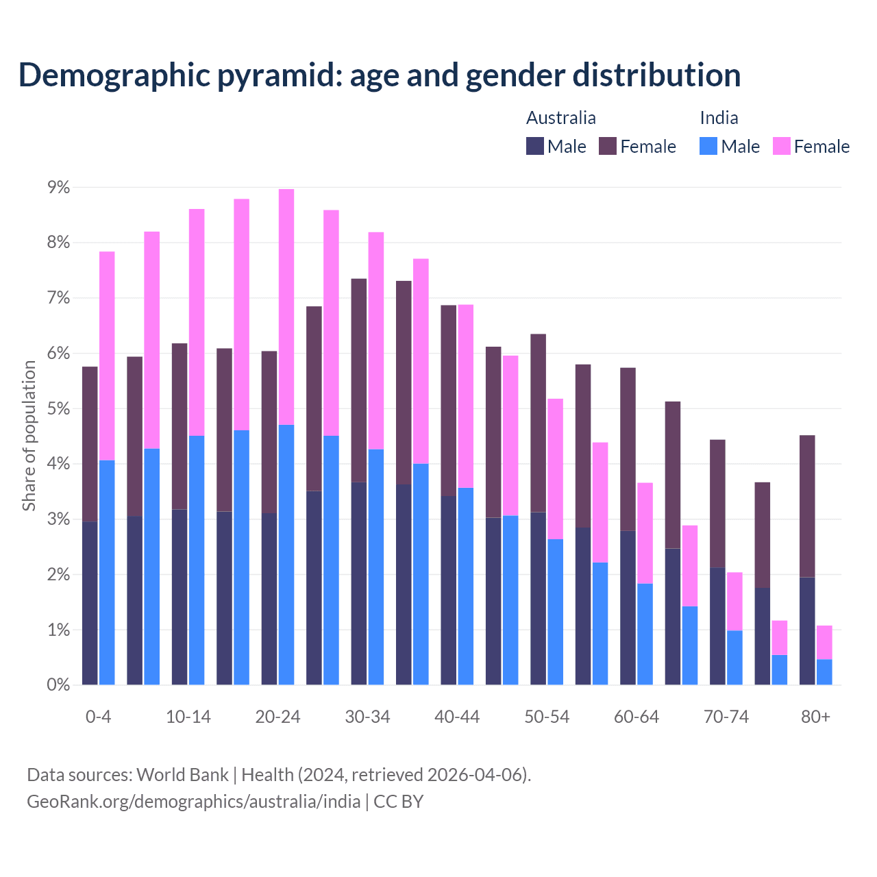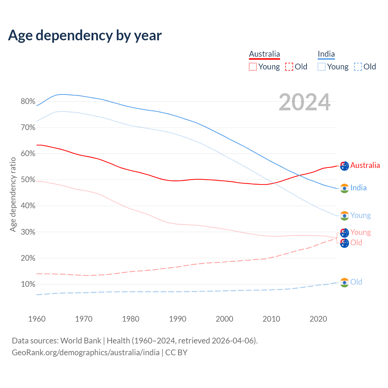 - Australia is ranked 55/196 by median age (oldest to youngest) vs 108/196 for India.