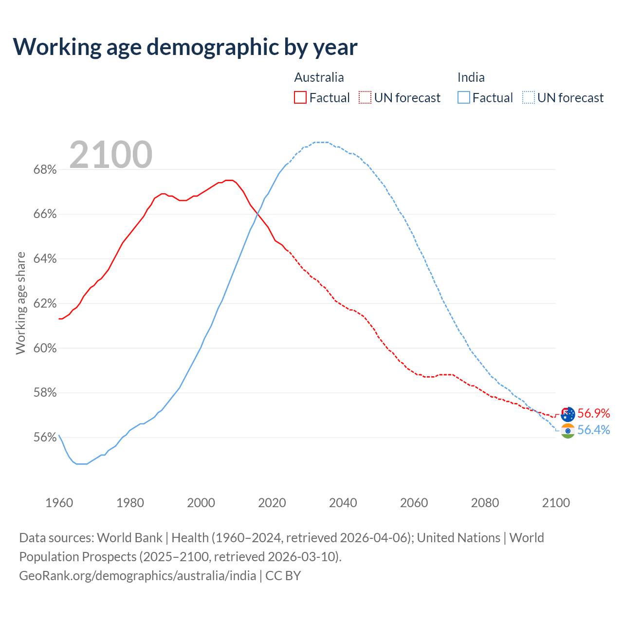 - Australia has 17.9M working age adults (aged 15-64) vs 1.01B in India.