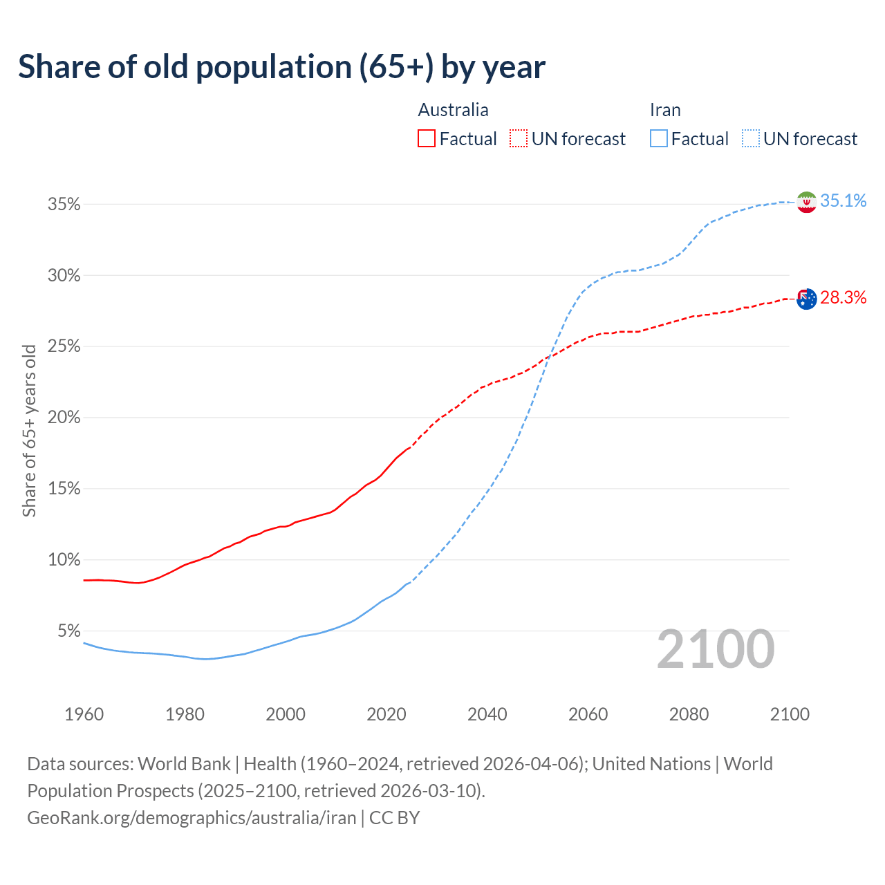 - The share of old-age demographic (65+) in Australia is 17.7% vs 8.24% in Iran.