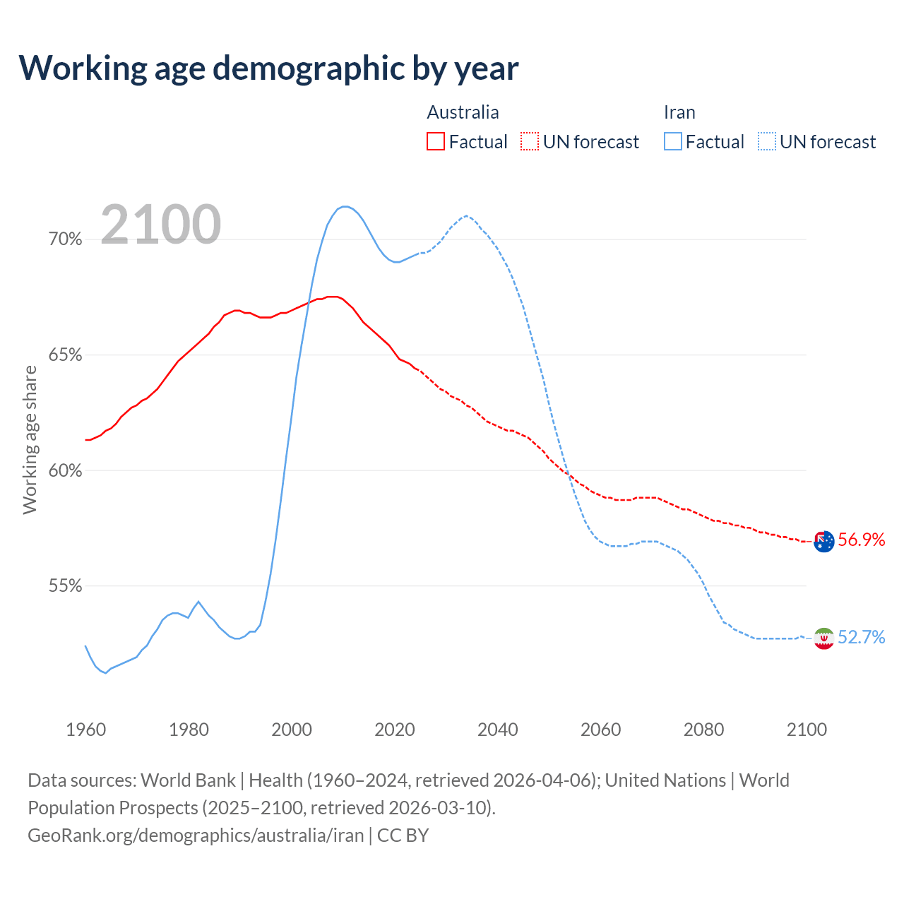 - Australia has 17.9M working age adults (aged 15-64) vs 64.8M in Iran.