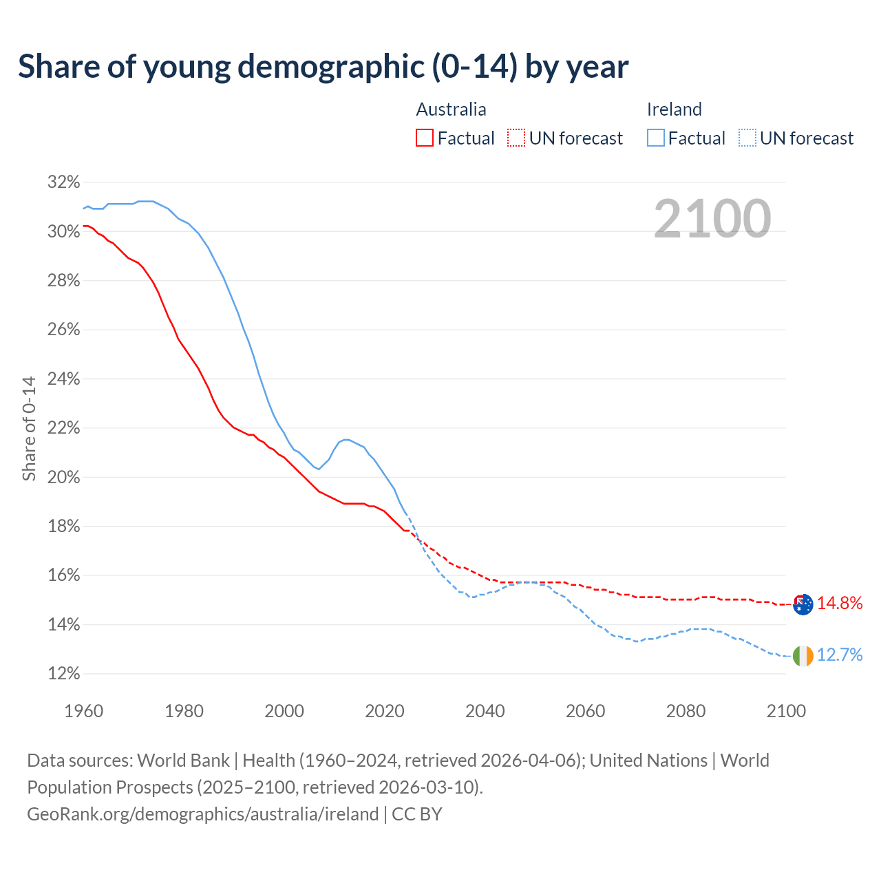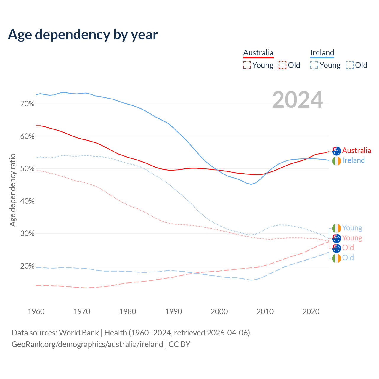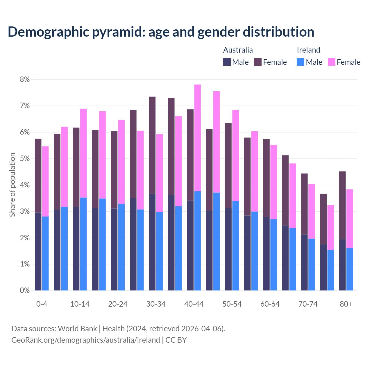 - Australia is ranked 55/196 by median age (oldest to youngest) vs 48/196 for Ireland.