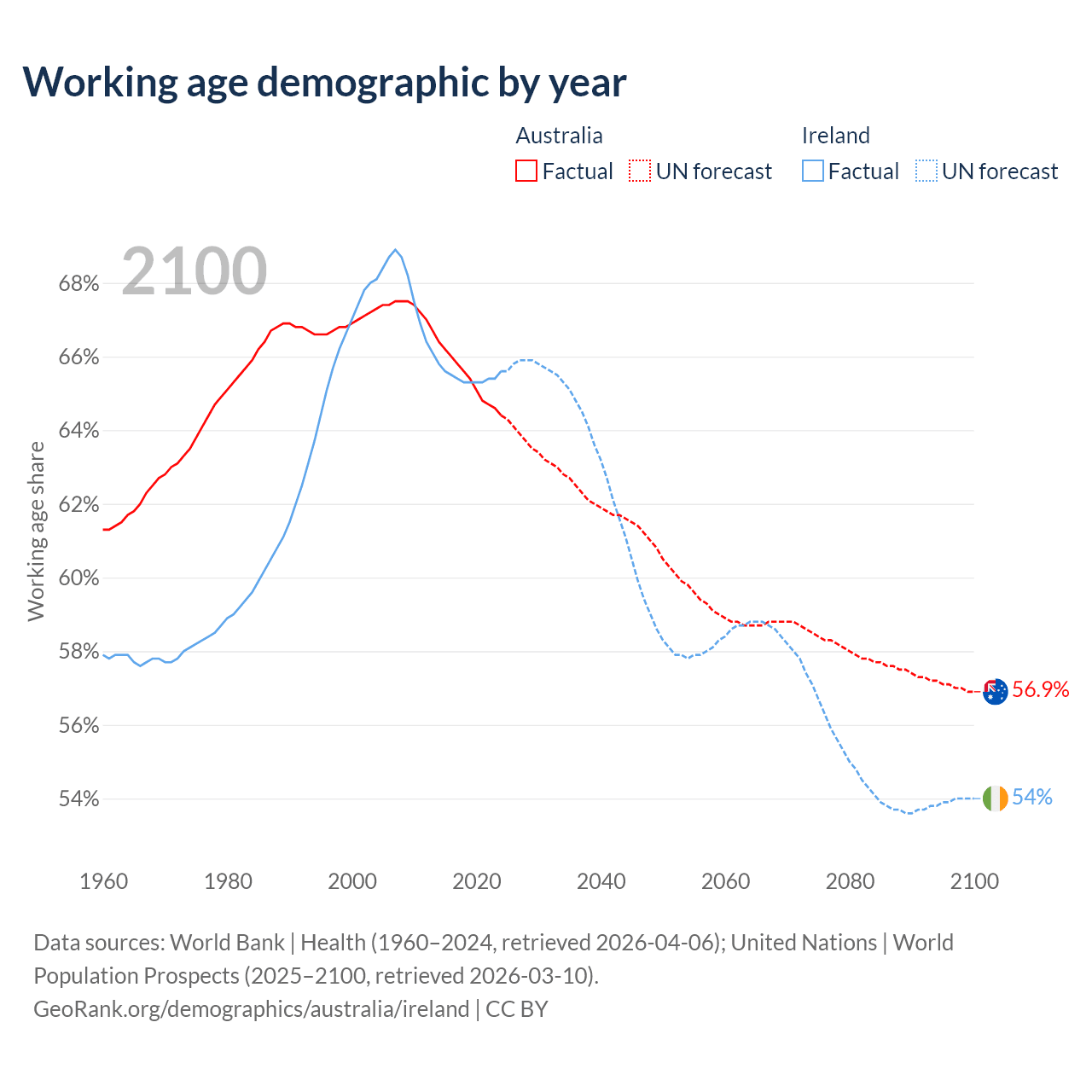 - Australia has 17.9M working age adults (aged 15-64) vs 3.62M in Ireland.