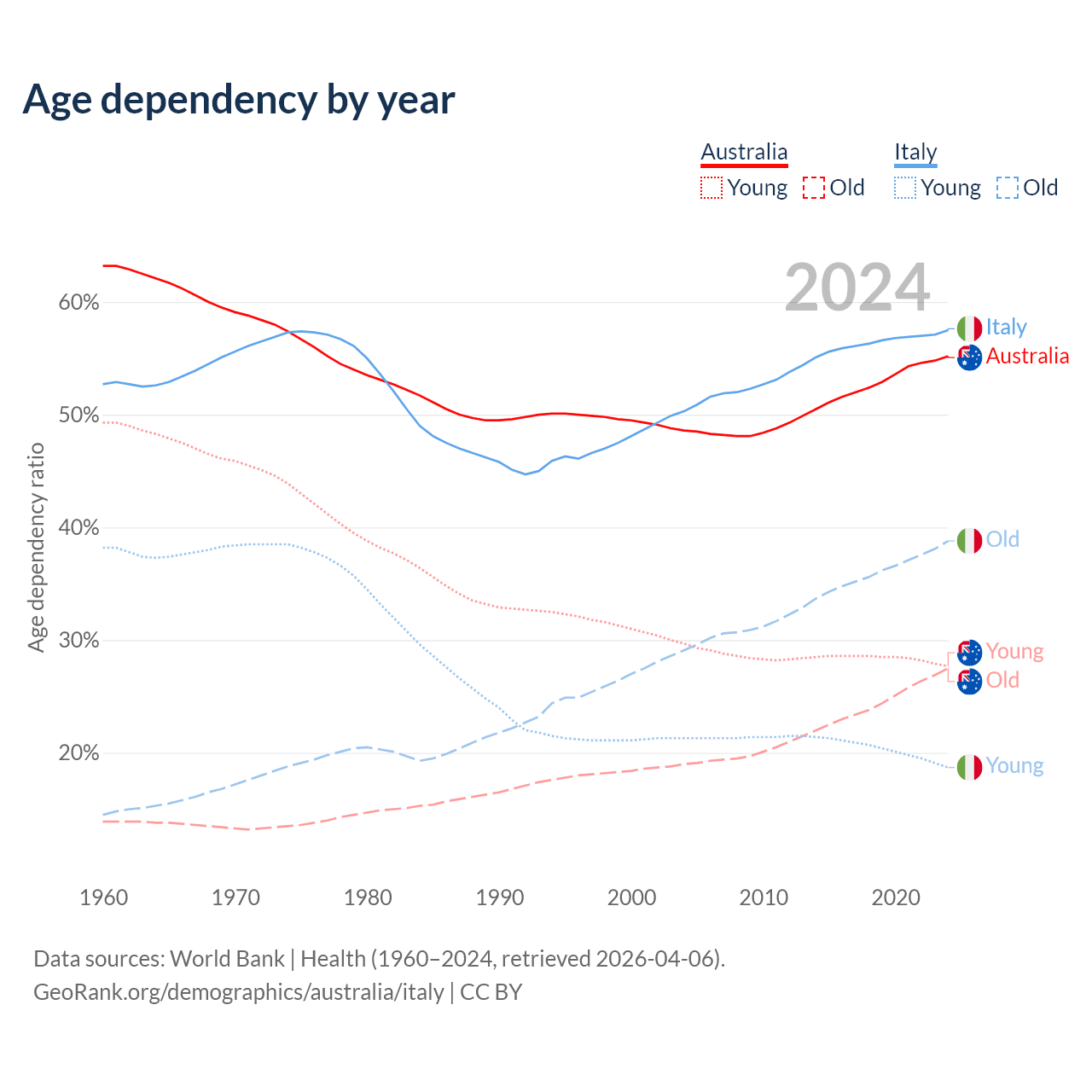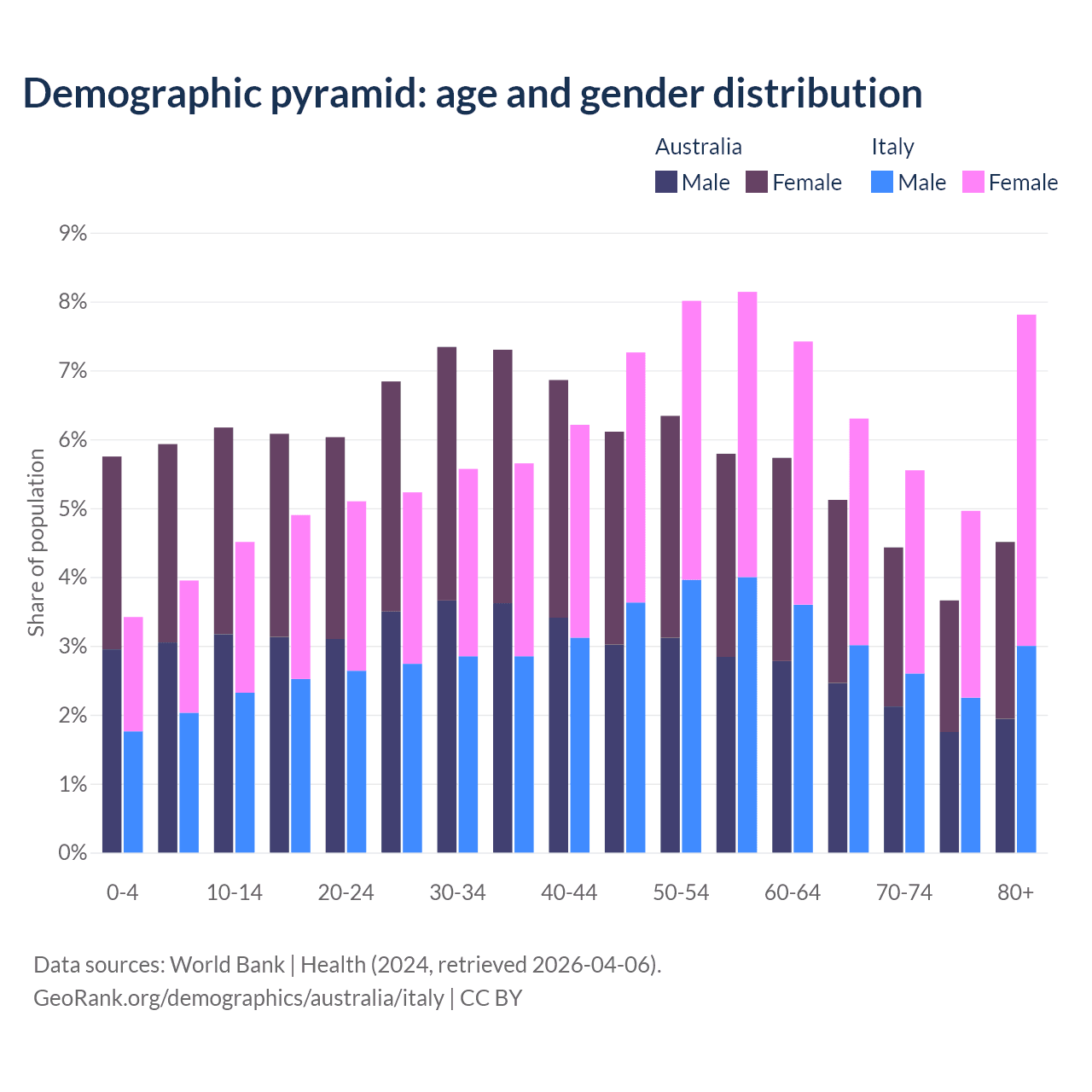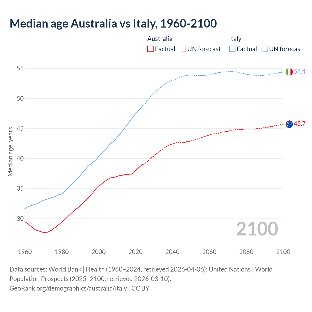 - Australia is ranked 55/196 by median age (oldest to youngest) vs 4/196 for Italy.