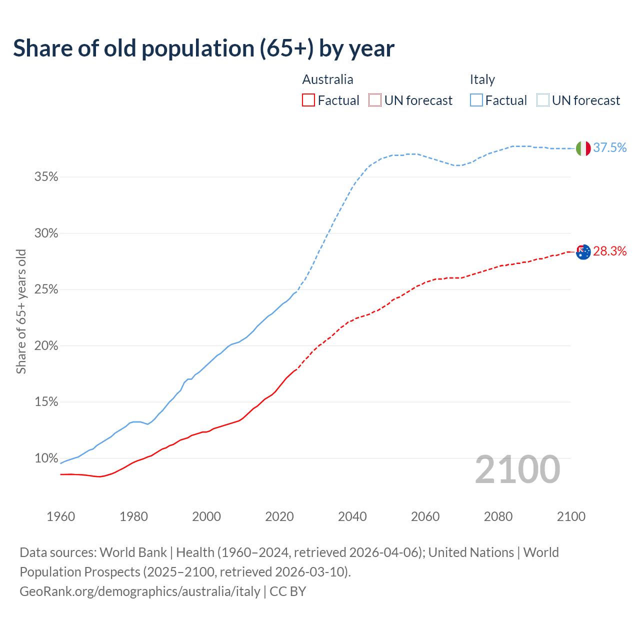 The share of older people aged 65 and over is 17.7% in Australia and 24.6% in Italy. Life expectancy in Australia compared to Italy .