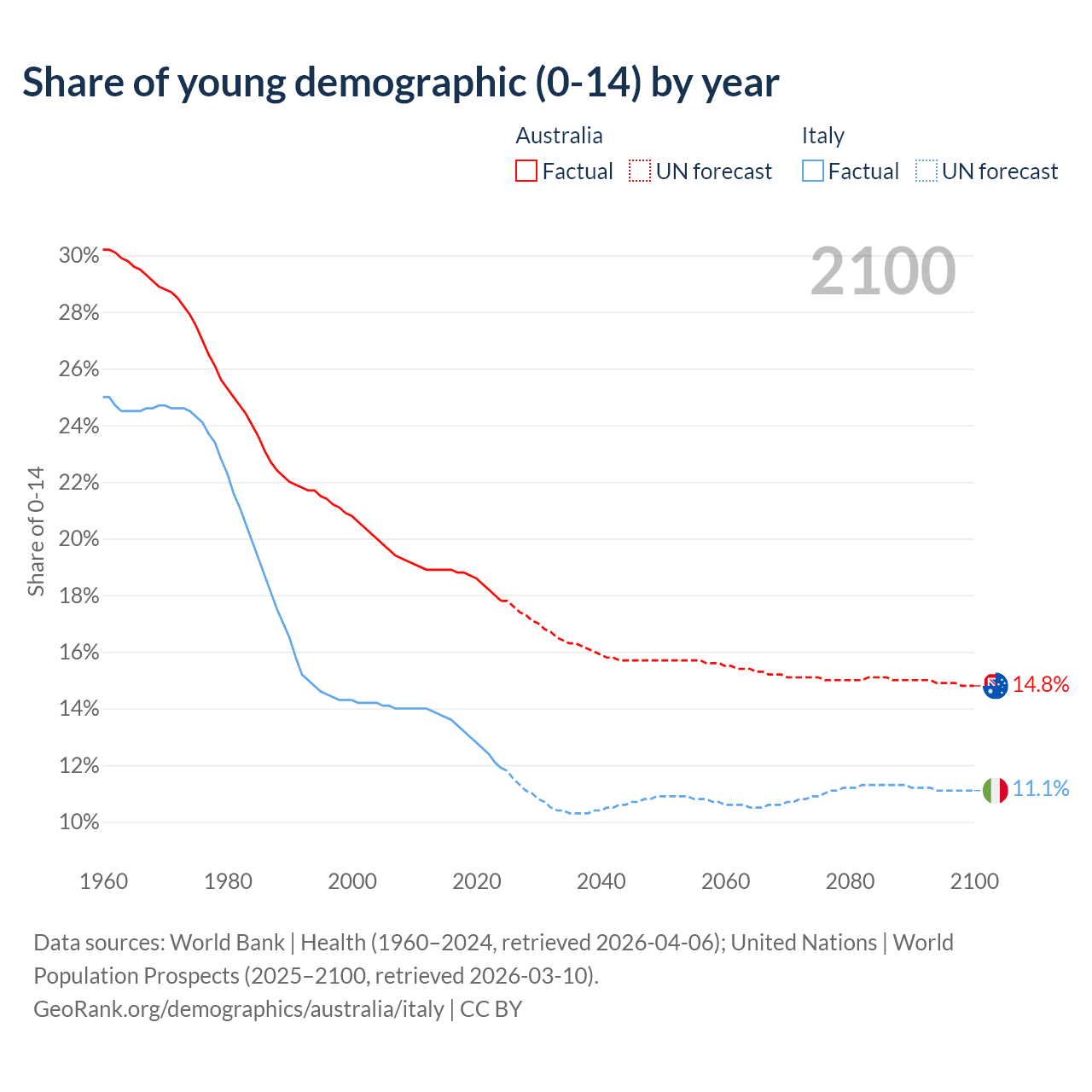 - The share of young demographic (0-15 years old) in Australia is 17.8% vs 11.9% in Italy.