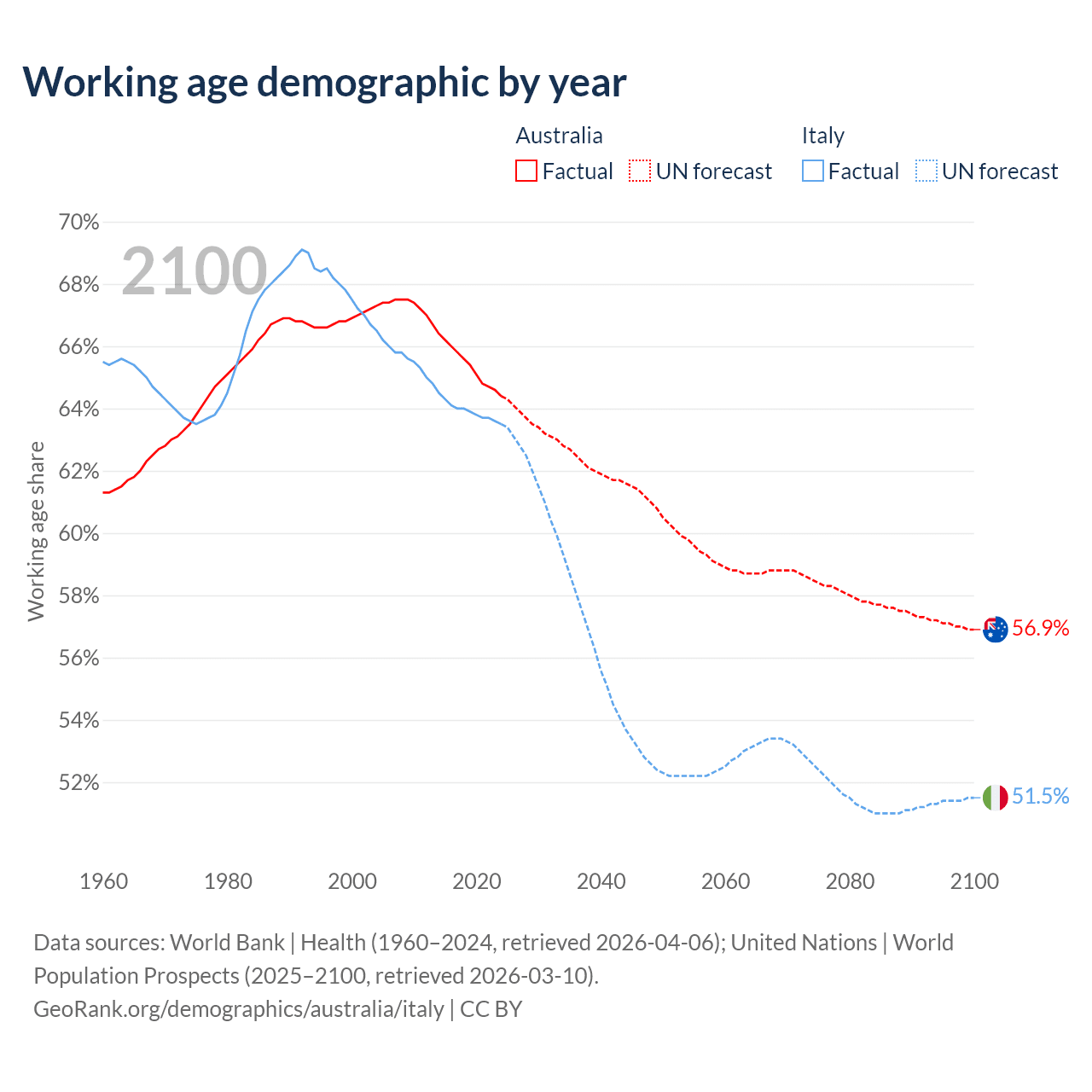 - Australia has 17.9M working age adults (aged 15-64) vs 37.2M in Italy.