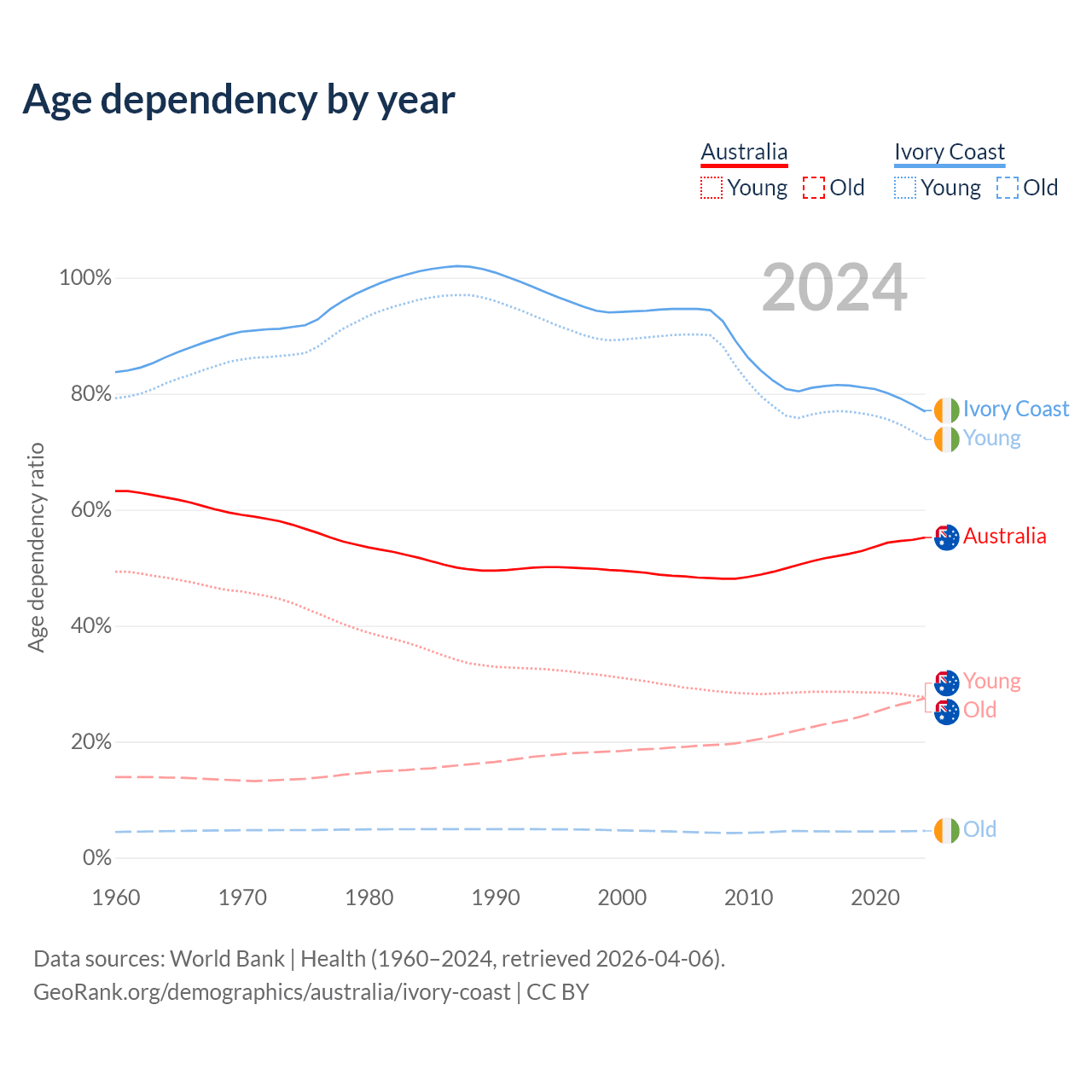 - Australia is ranked 55/196 by median age (oldest to youngest) vs 175/196 for Ivory Coast.