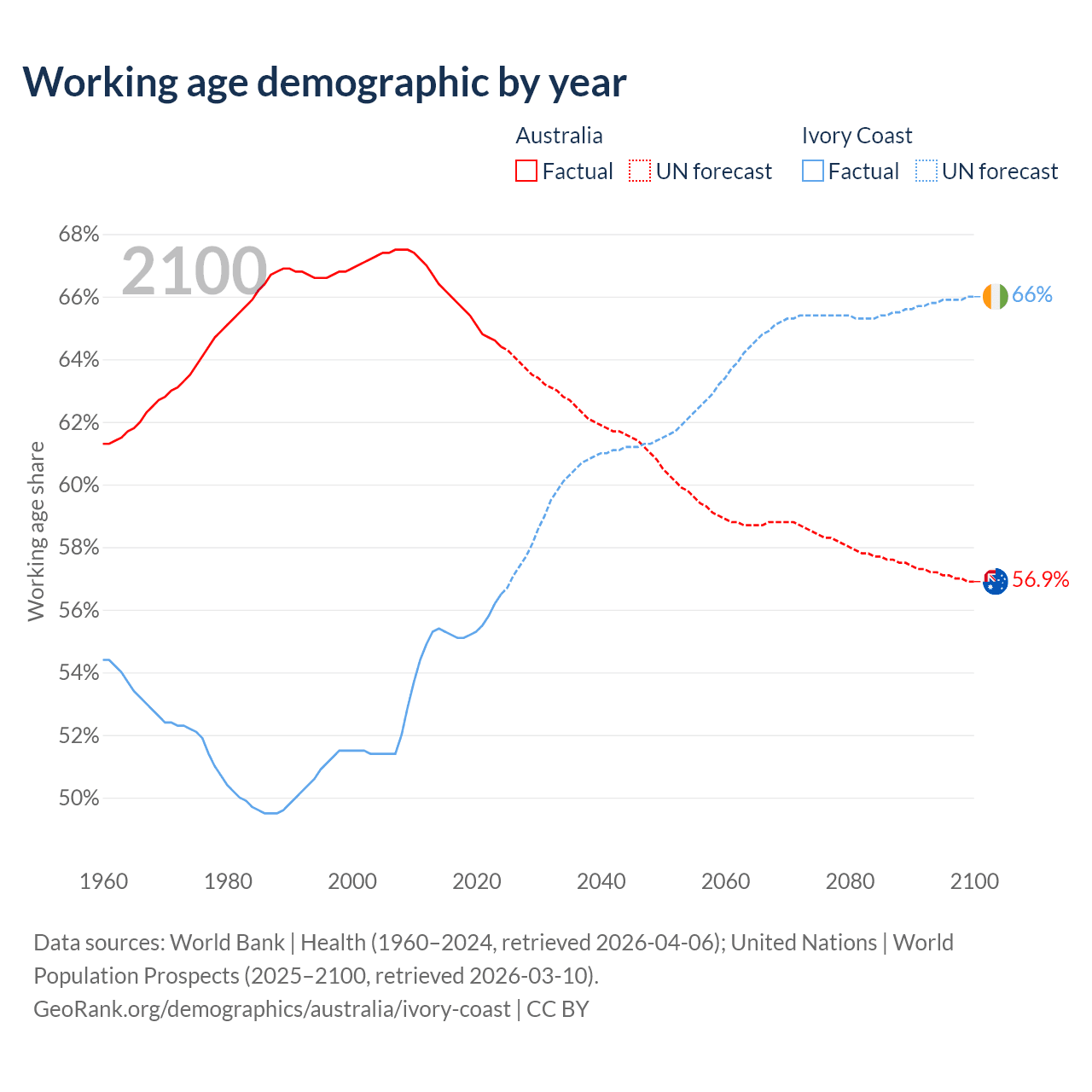 Median age Australia vs Ivory Coast, 1960-2100