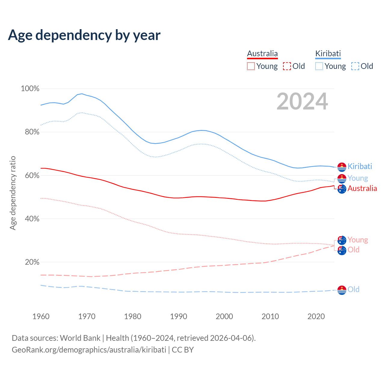 - The share of old-age demographic (65+) in Australia is 17.7% vs 4.24% in Kiribati.