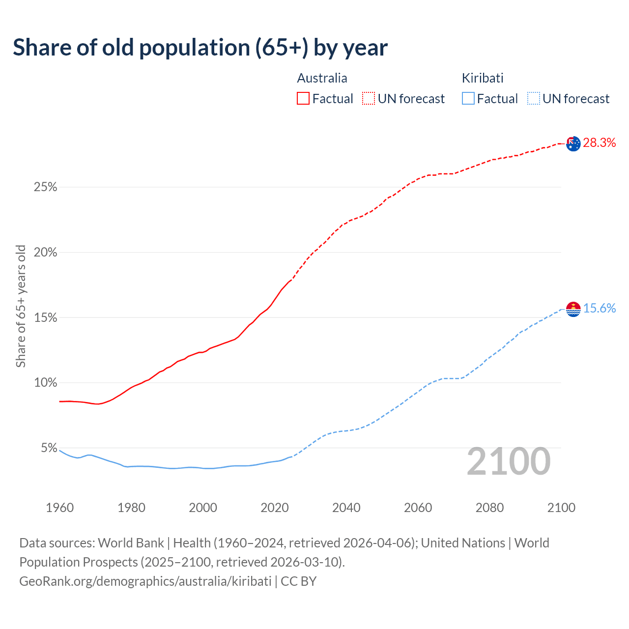 The share of older people aged 65 and over is 17.7% in Australia and 4.24% in Kiribati. Life expectancy in Australia compared to Kiribati .