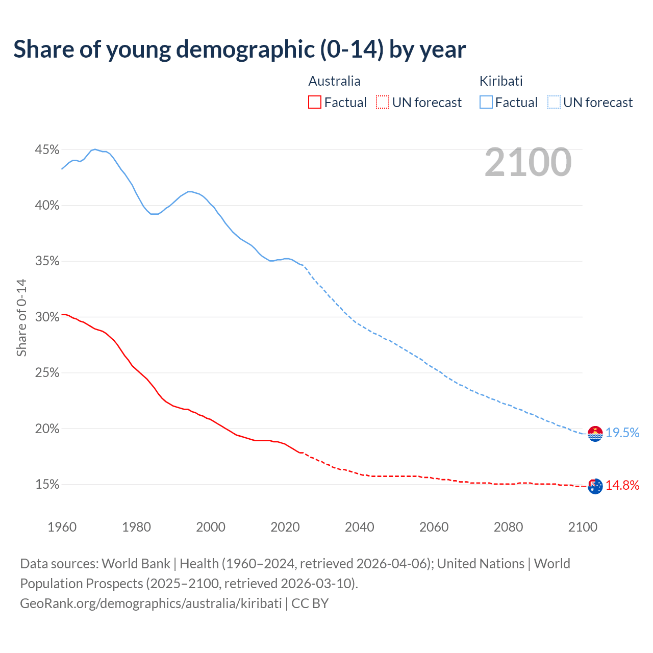 - The share of young demographic (0-15 years old) in Australia is 17.8% vs 34.7% in Kiribati.