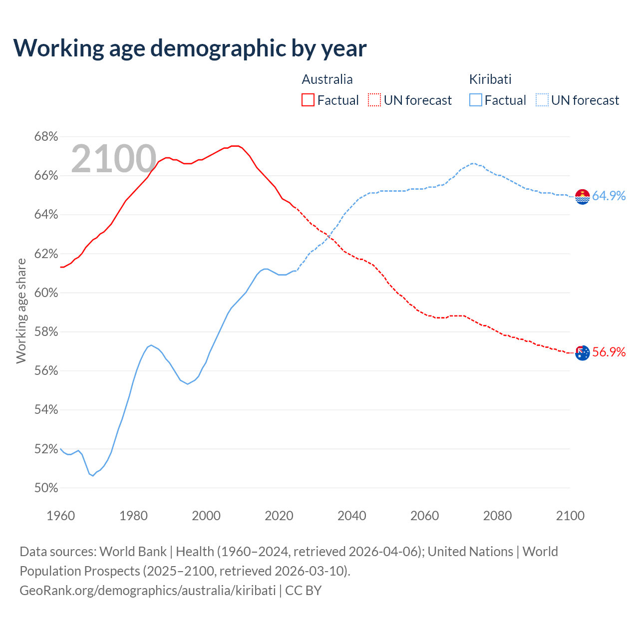 - Australia has 17.9M working age adults (aged 15-64) vs 84.9K in Kiribati.