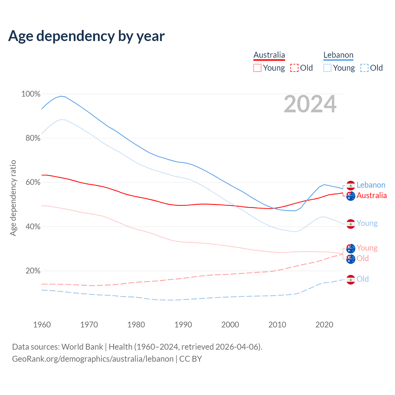 - Australia is ranked 55/196 by median age (oldest to youngest) vs 106/196 for Lebanon.