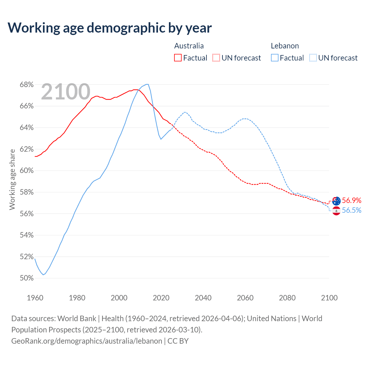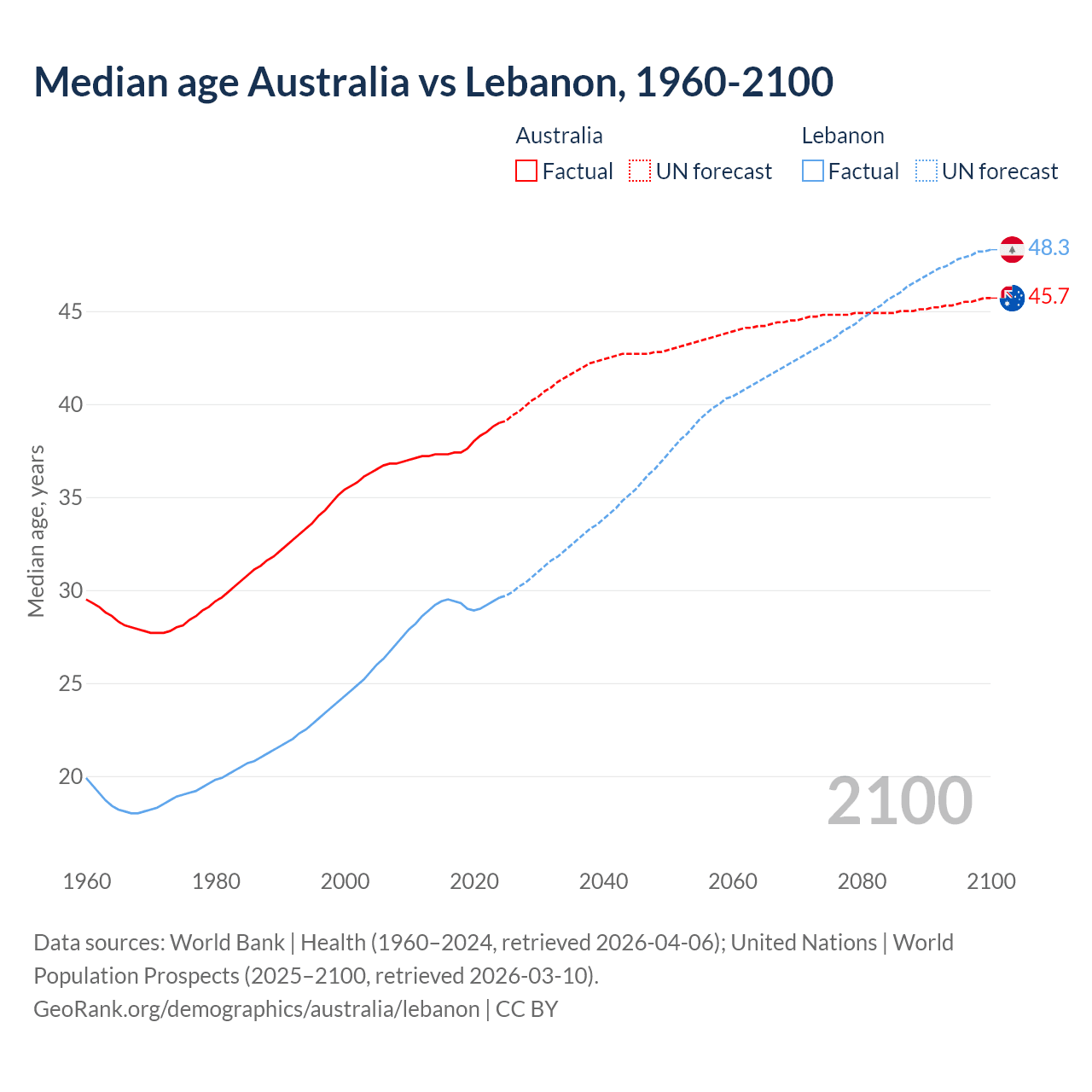 Median age Australia vs Lebanon, 1960-2100