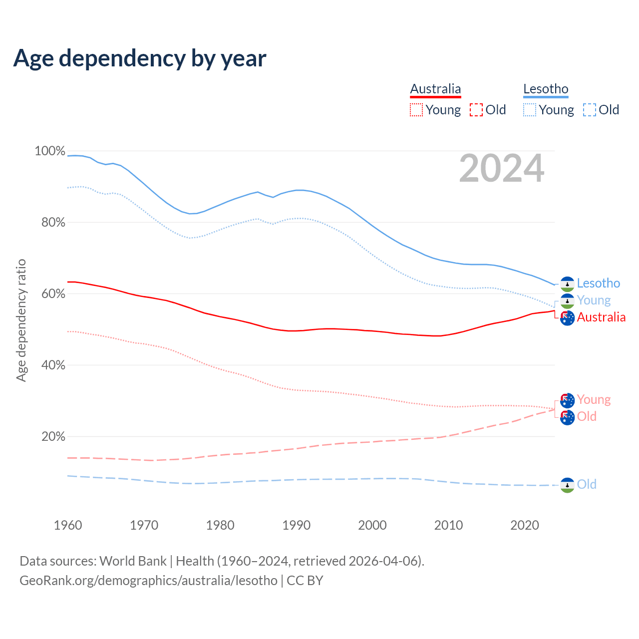 - The share of old-age demographic (65+) in Australia is 17.7% vs 3.86% in Lesotho.