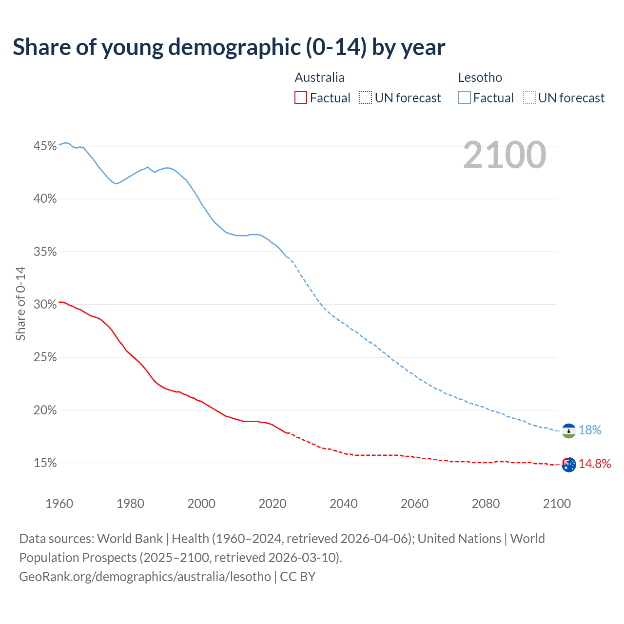 - The share of young demographic (0-15 years old) in Australia is 17.8% vs 34.5% in Lesotho.