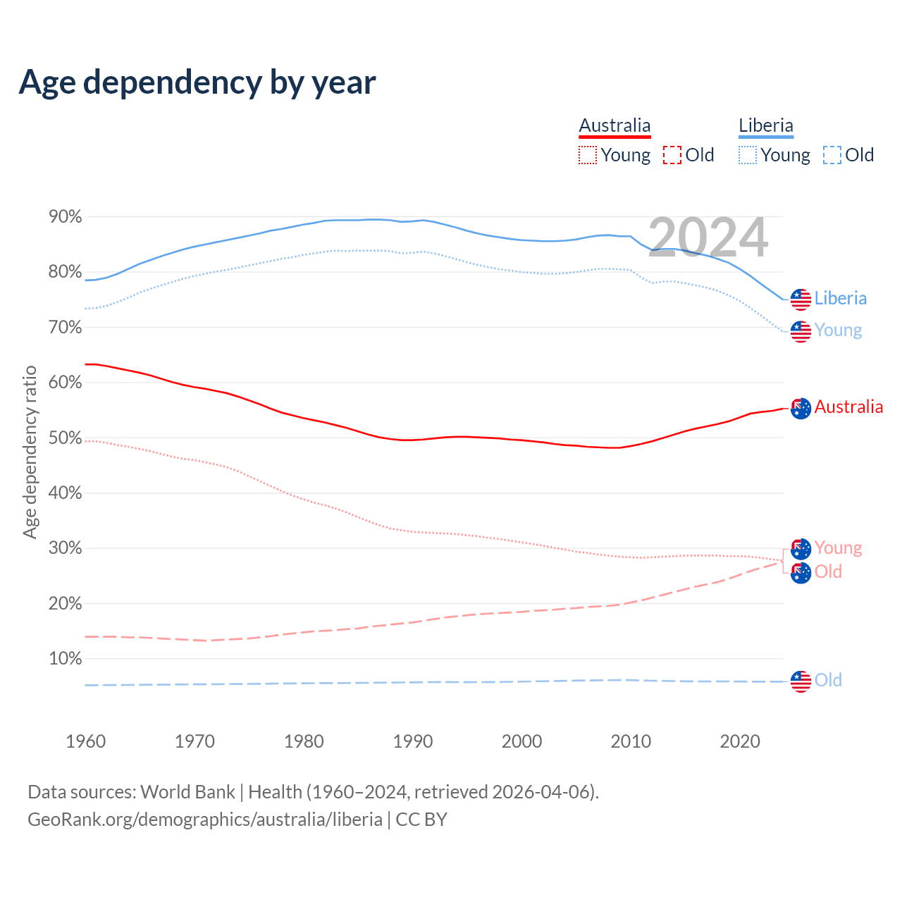 - Australia is ranked 55/196 by median age (oldest to youngest) vs 169/196 for Liberia.