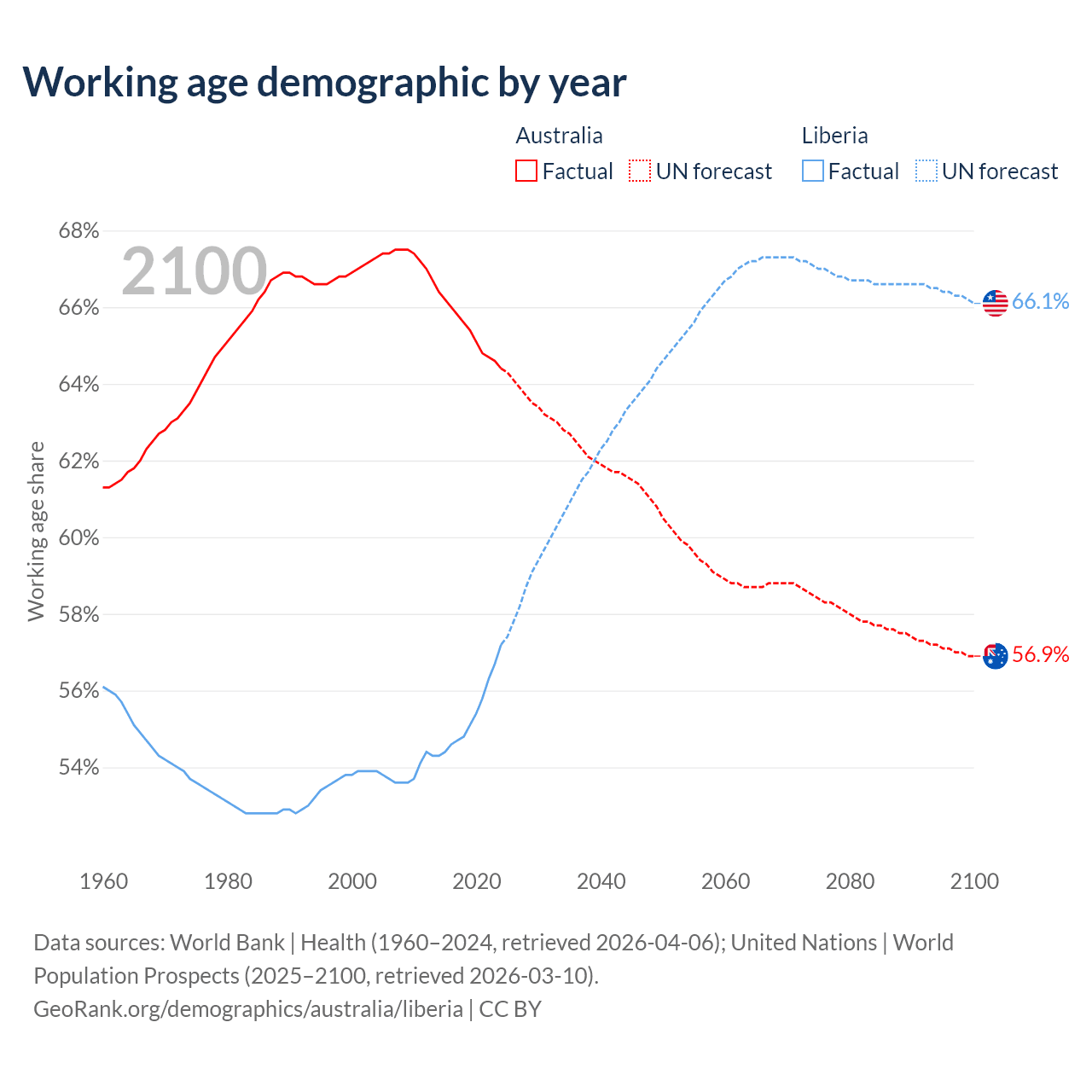 - Australia has 17.9M working age adults (aged 15-64) vs 3.37M in Liberia.