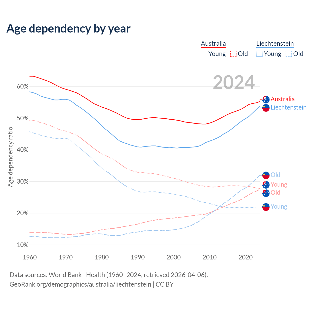 - The share of old-age demographic (65+) in Australia is 17.7% vs 20.7% in Liechtenstein.