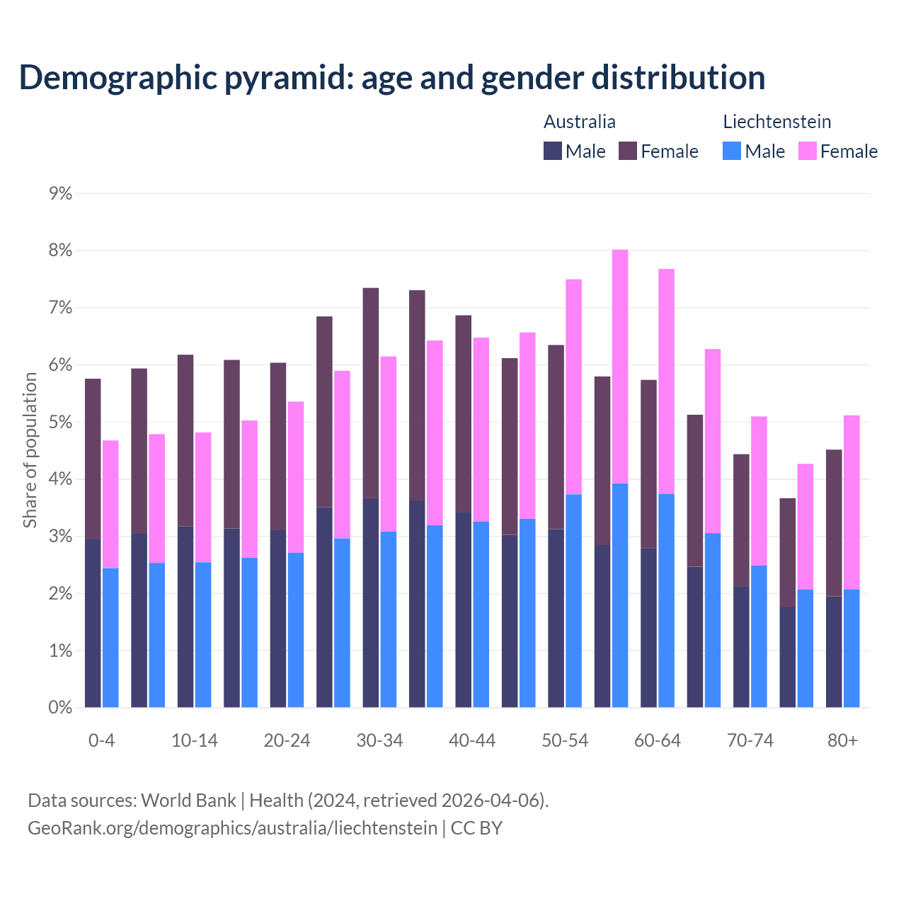 The share of older people aged 65 and over is 17.7% in Australia and 20.7% in Liechtenstein. Life expectancy in Australia compared to Liechtenstein .