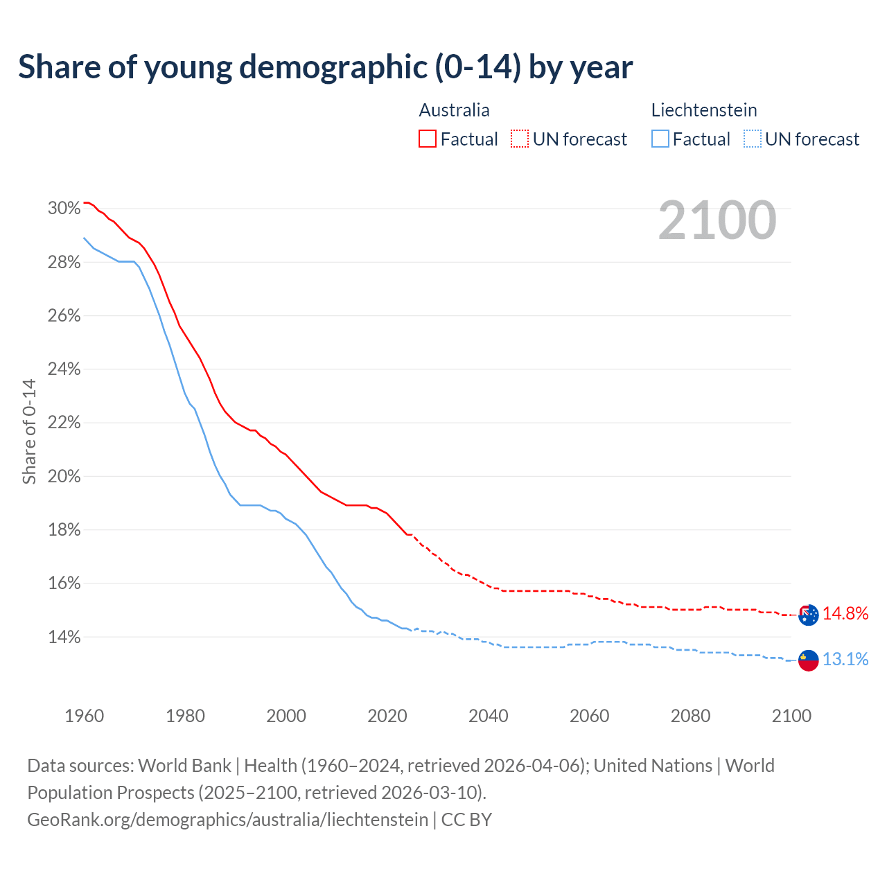 - The share of young demographic (0-15 years old) in Australia is 17.8% vs 14.3% in Liechtenstein.