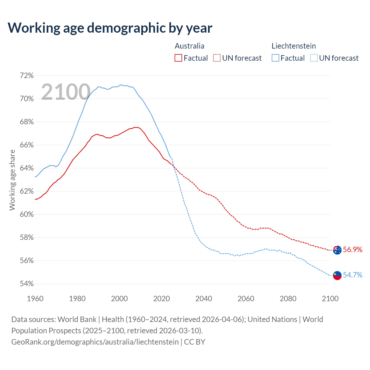 Median age Australia vs Liechtenstein, 1960-2100