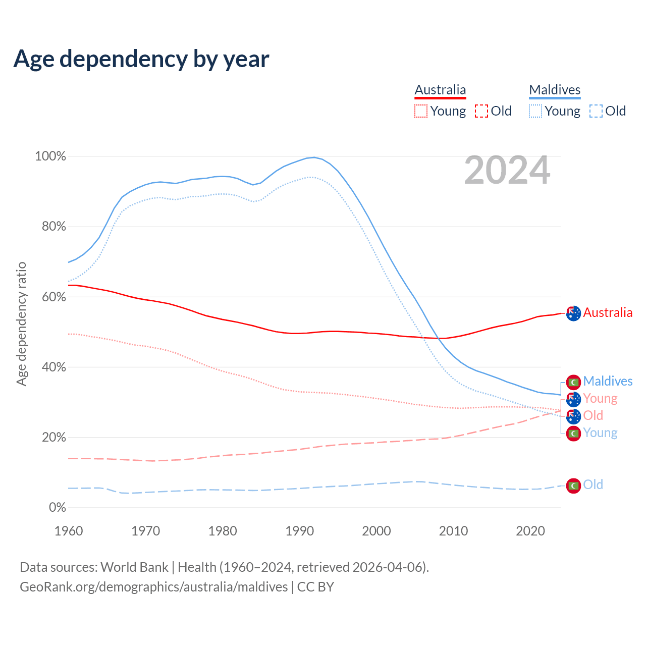 - The share of old-age demographic (65+) in Australia is 17.7% vs 4.64% in Maldives.