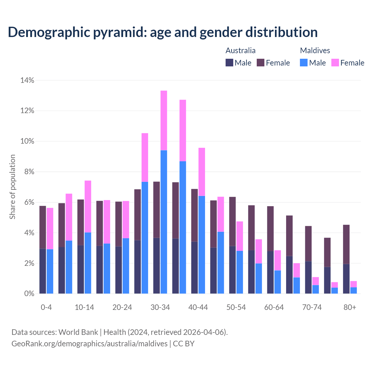 - Australia is ranked 55/196 by median age (oldest to youngest) vs 90/196 for Maldives.