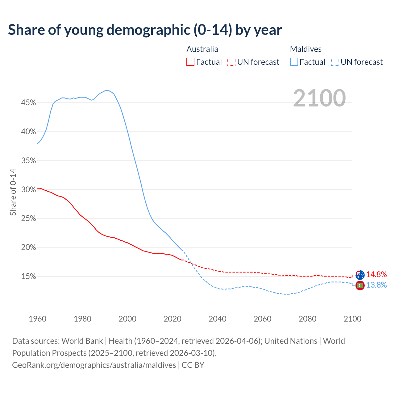 - The share of young demographic (0-15 years old) in Australia is 17.8% vs 19.6% in Maldives.